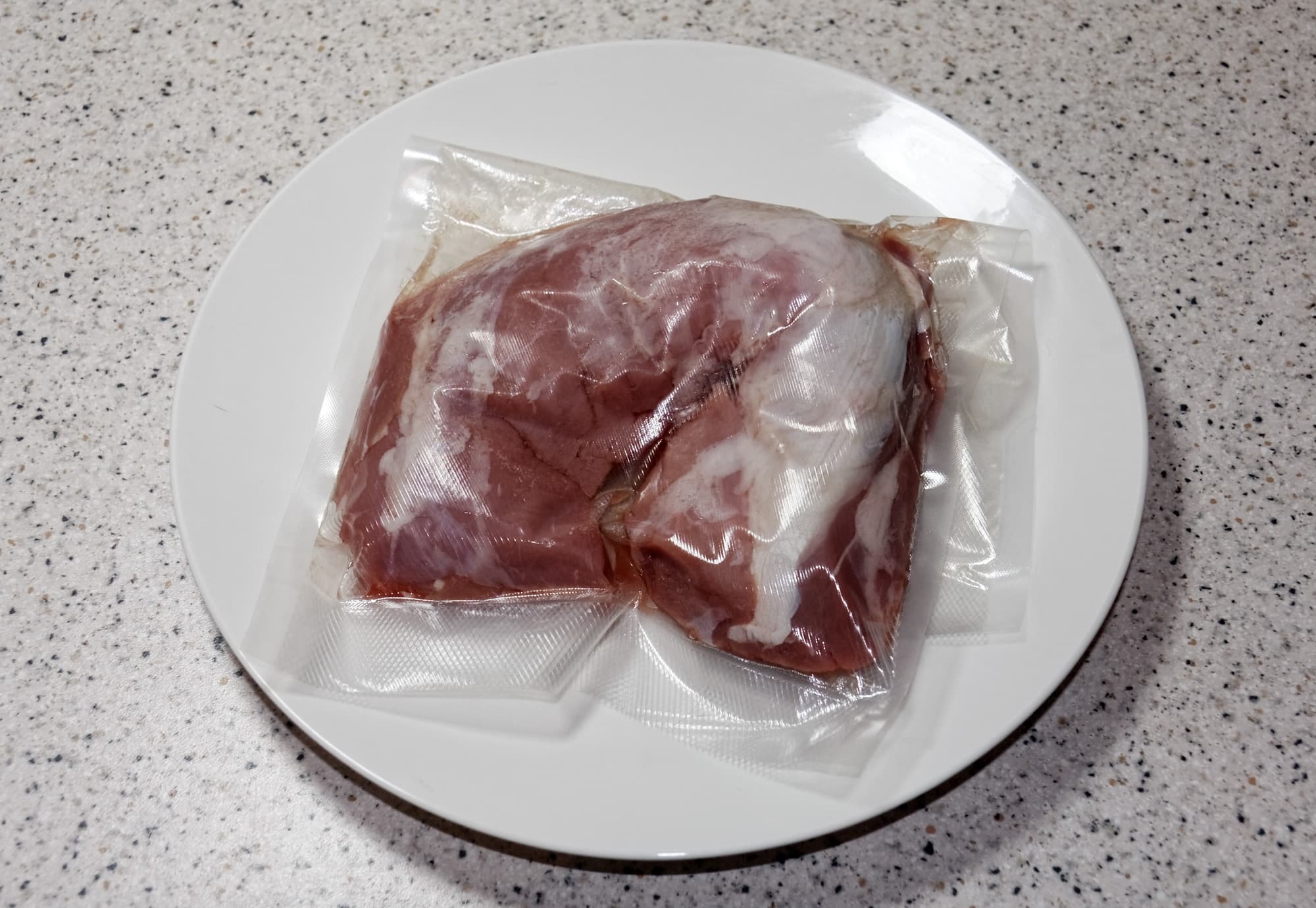 Мы поместили в вакуумный пакет вырезку, соль с сахаром (пропорция 5:2, общий вес — 1%-1,5% от веса мяса) и отправили в воду, разогретую до подходящей температуры.
