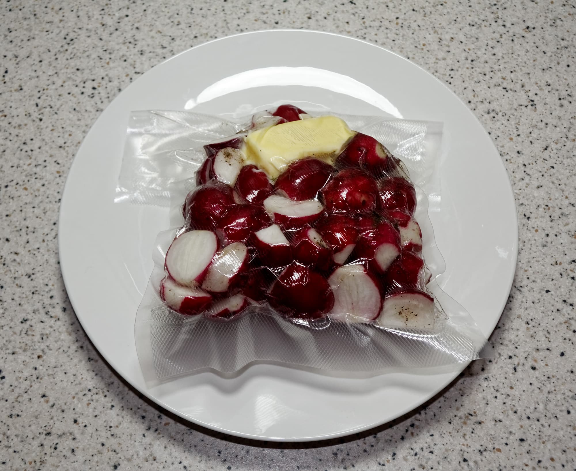 Редис очищается от хвостиков и режется пополам (особо крупный — на 4 части), смешивается с остальными ингредиентами, вакуумируется в пакете, после чего отправляется в мультиварку или су-вид и готовится в горячей воде при температуре 82 °C в течение 45 минут.