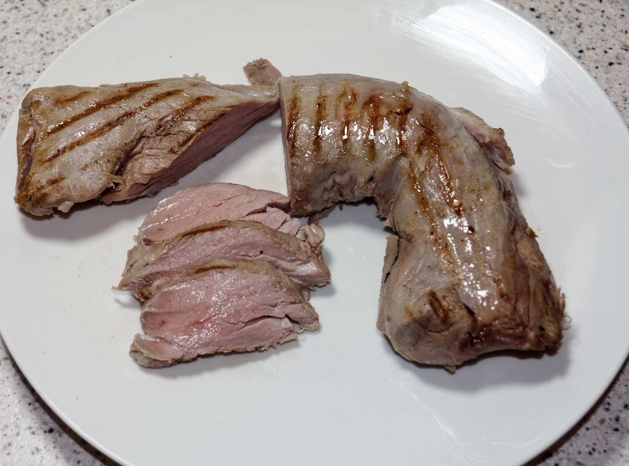 Как и ожидалось, мясо оказалось равномерно приготовленным и крайне мягким (небольшие куски вырезки можно было с легкостью разделить пополам даже без помощи ножа).