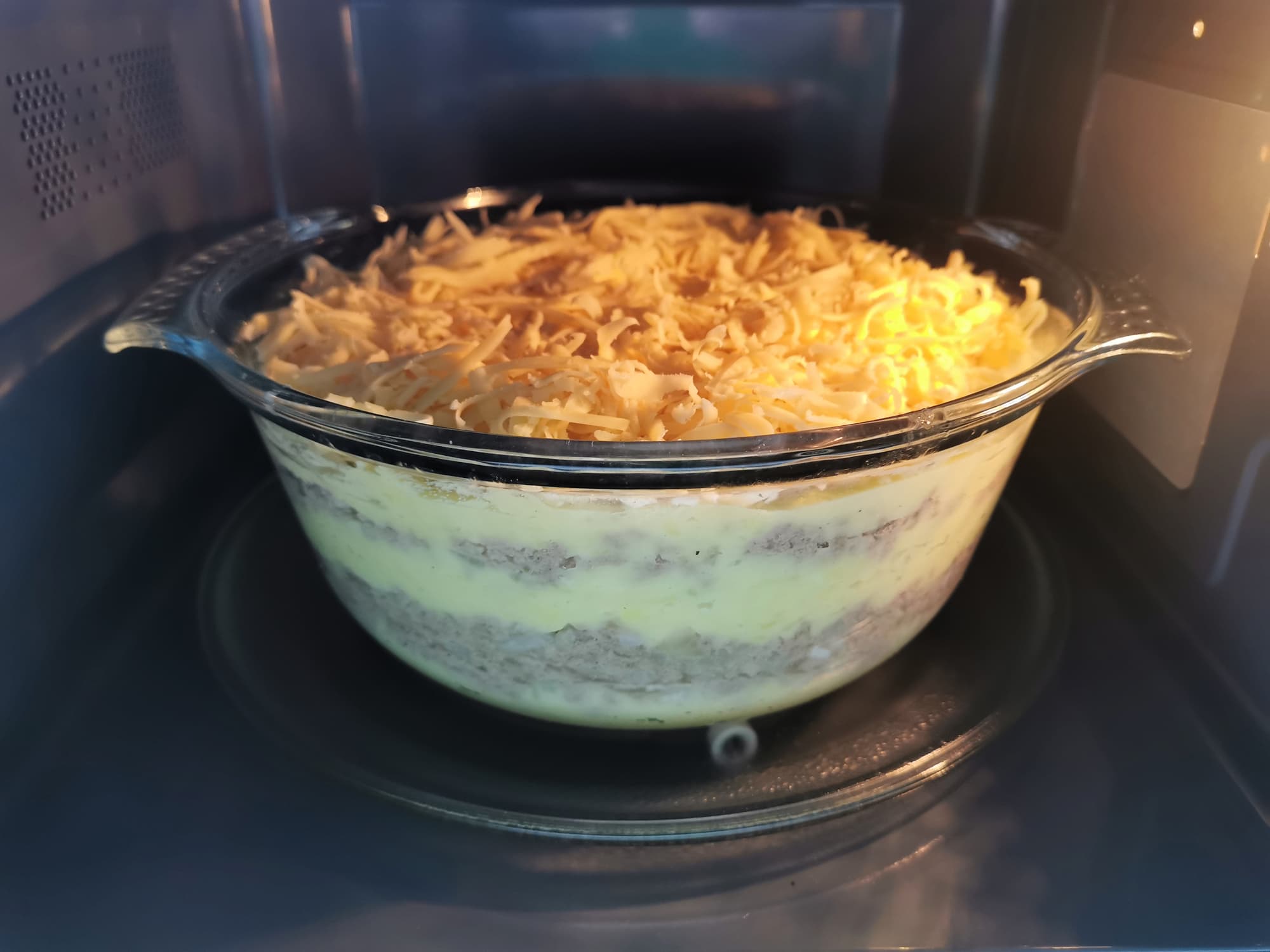 Сначала мы запекали картофель в тканевом пакете, потом горячим размяли его толкушкой (но можно сделать это блендером со специальной насадкой для приготовления пюре), добавили масла, молока, специи, сыр, пару яиц. В среднем 600 г картофеля запекаются на максимальной мощности 10 минут. Фарш для запеканки тоже разморозили в СВЧ — удобно, пока он размораживается, сделать все процедуры с другими продуктами. Фарш смешали с нарезанным луком и специями, после чего отправили на 8 минут в микроволновку, установив максимальную мощность. Фарш отлично пропекся, а лук стал мягким. Потом собрали запеканку в стеклянной форме: нижний слой — пюре, средний — фарш, верхний — пюре. Верх посыпали тертым сыром.