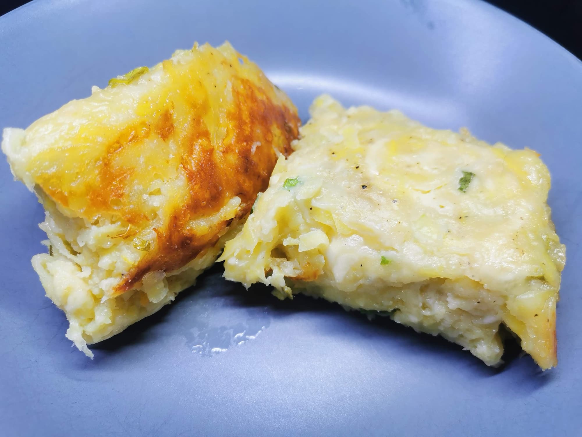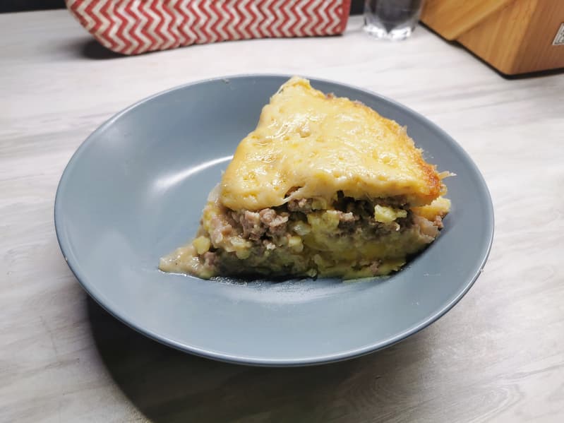 Нам так понравилось, что мы заменили картошку кабачками, фарш — нарезанным куриным филе, сыр ничем не заменяли — и приготовили еще одну запеканку. Все то же самое можно, конечно, делать в духовке, но вот и мини-печи отлично справляются — главное, чтобы в камеру помещалась нужная форма.