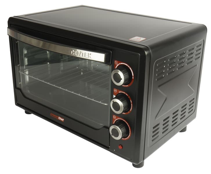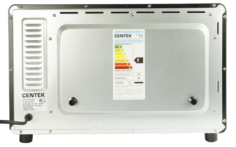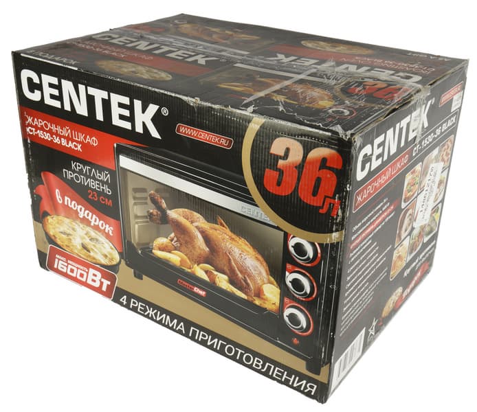Centek CT-1530-36 Black заметно крупнее типичной микроволновки, хотя внешне очень похож на нее: железный короб, дверца из жаропрочного стекла, крупная ручка, с правой стороны рычаги управления. Всего этот стильный красавец «в черном» весит 8 кг, в него вмещается 36 литров.
