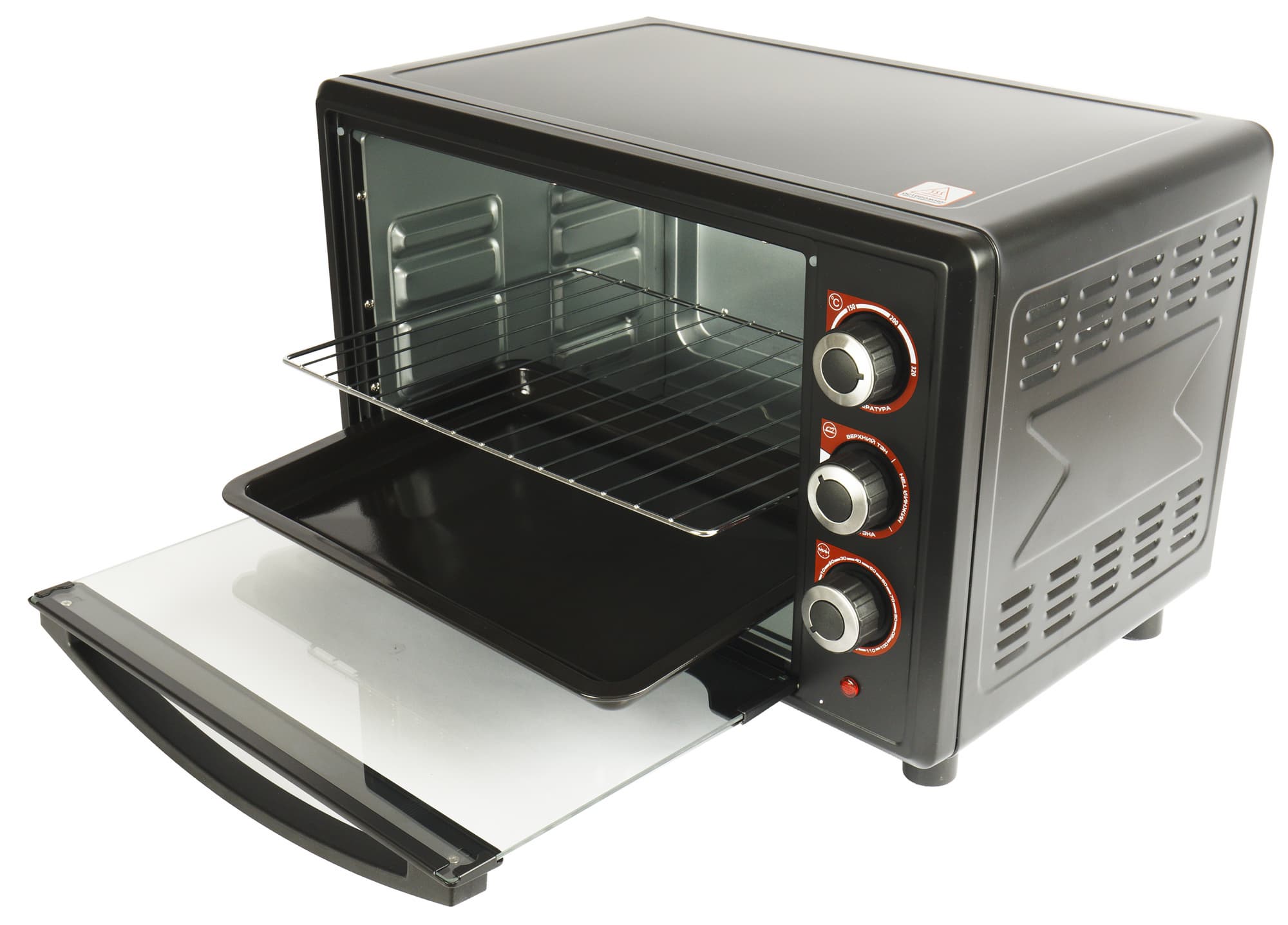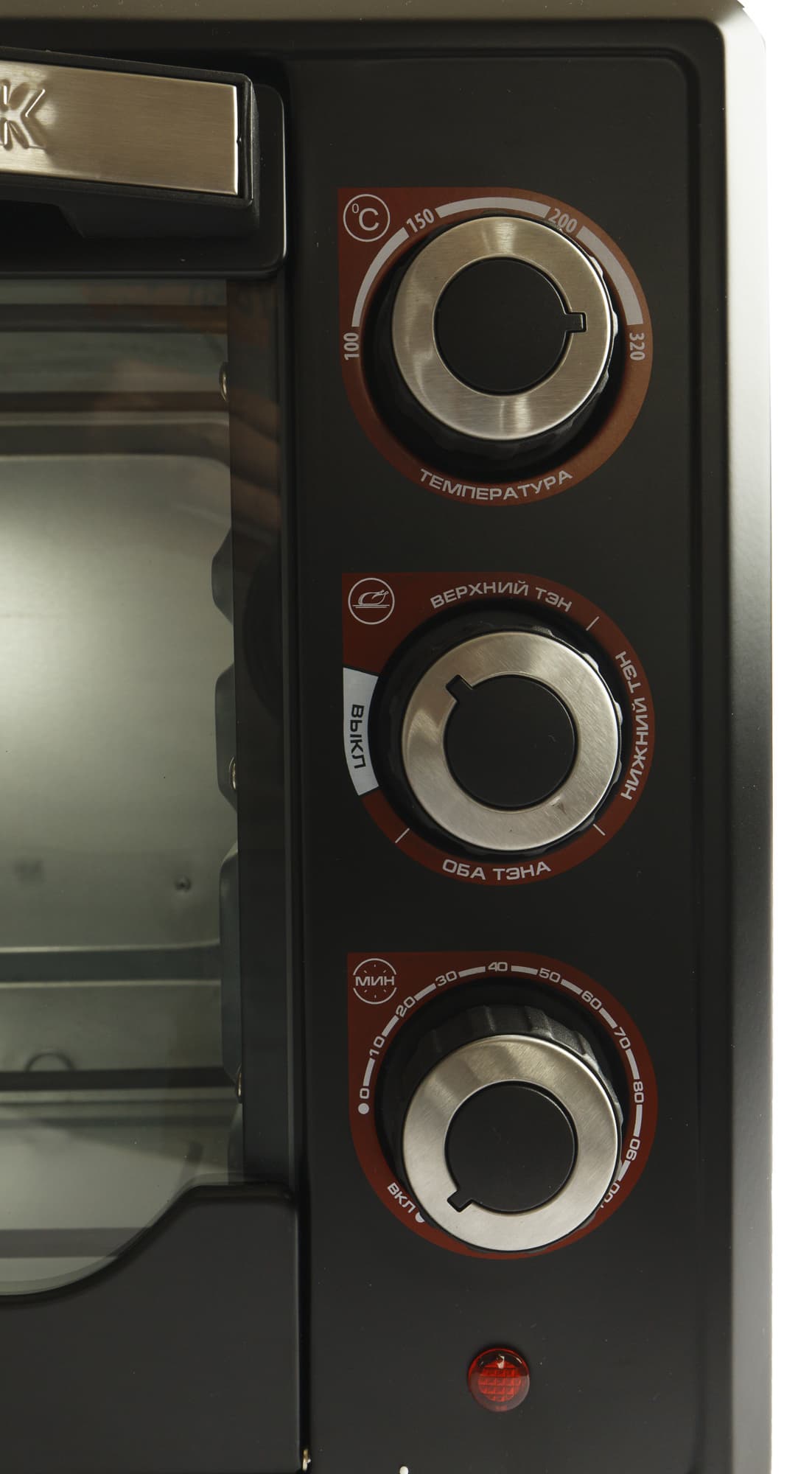 Панель управления с правой стороны подчеркнута красной обводкой каждого из трех круглых рычагов-регуляторов. Верхний — терморегулятор, вращается по часовой стрелке, увеличивая или уменьшая температуру внутри духовки от 100 до 320 °C. Под ним варианты режимов тэнов и таймер. Последний в ряду — светодиодный индикатор работы.