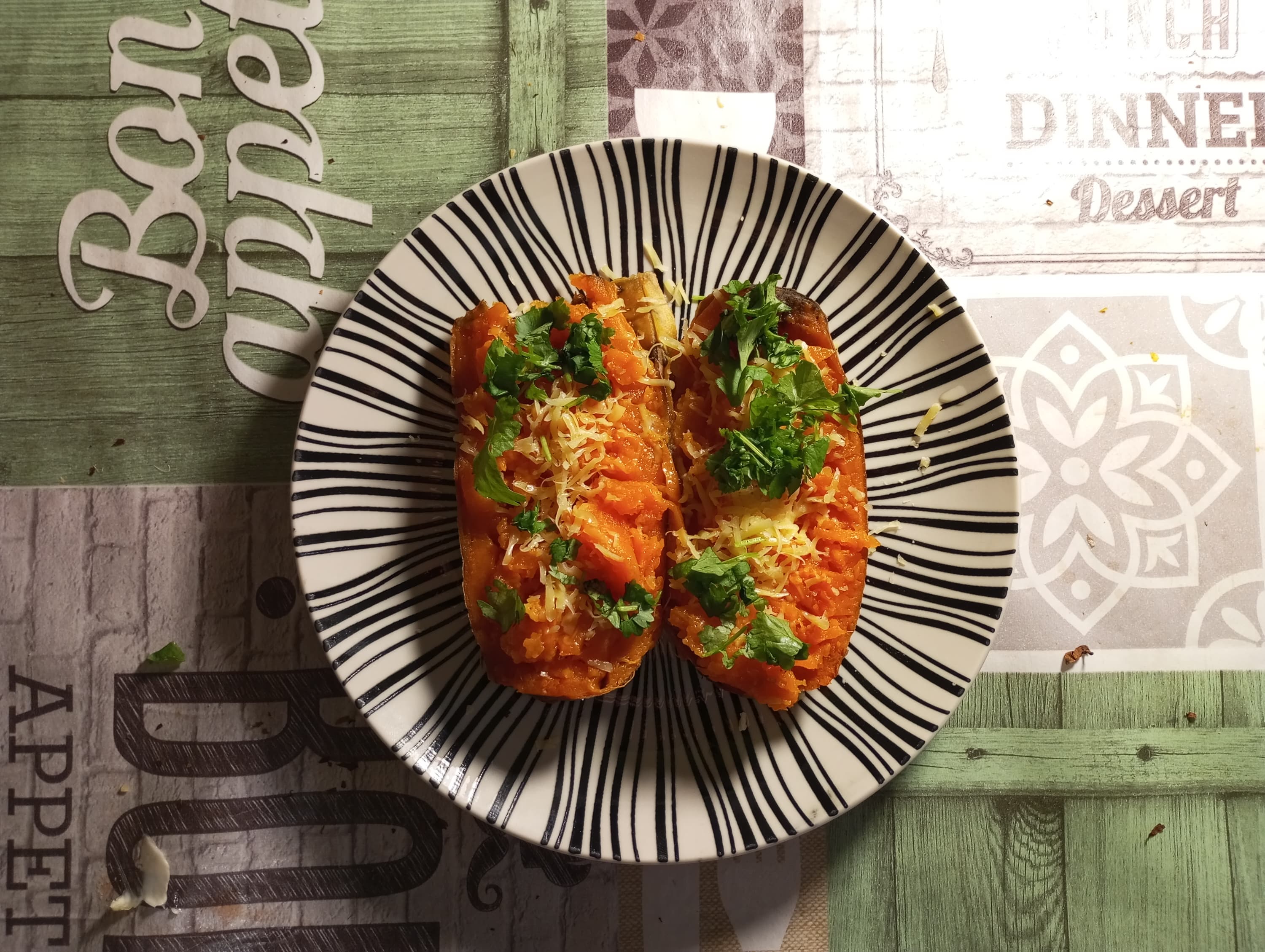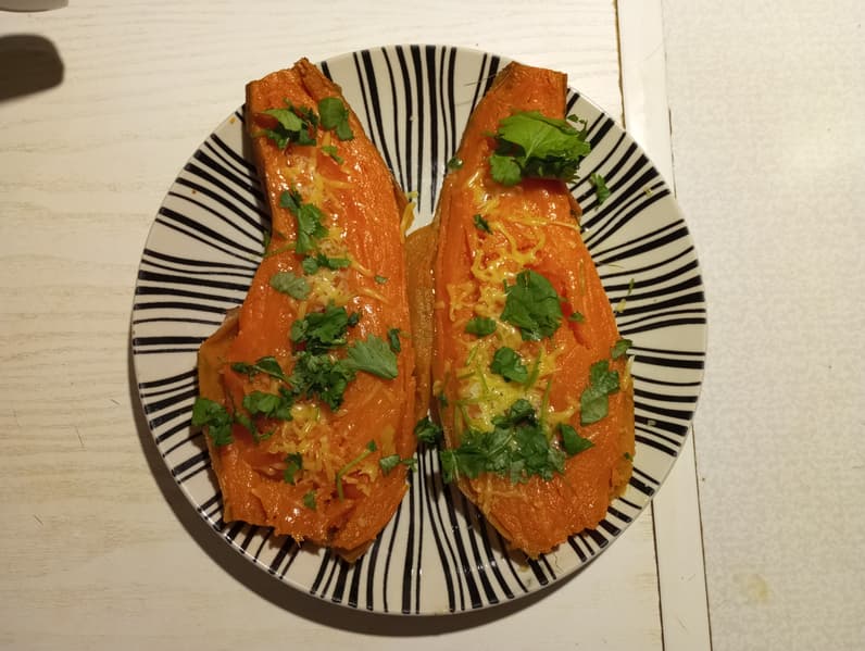 Готовое распаковываем, аккуратно разрезаем на две части, посыпаем тертым сыром и кинзой, немного солим по вкусу. Некоторые разминают батат перед подачей, кто-то добавляет сливочное масло и предпочитает есть цельный — любой вариант невероятно питательный и вкусный.