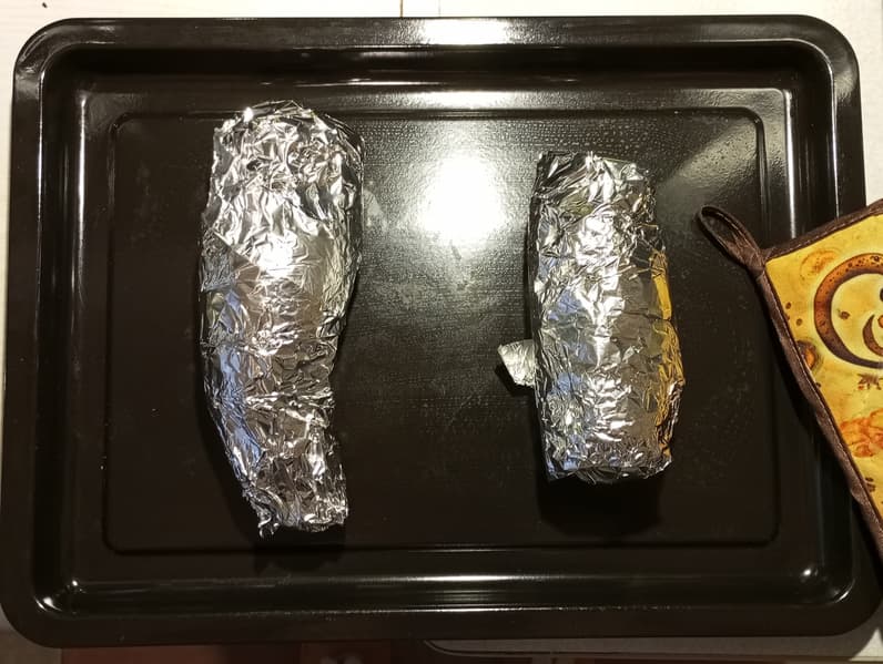 Клубни промываем, оборачиваем в фольгу, с одного бока протыкаем вилкой. Запекаем в шкафу при температуре 200 °C, комбинируя тэны, примерно 30-35 минут. Скорость приготовления во многом зависит от температуры и качества клубня, небольшого размера бататы запекались за 25 минут. Готовность можно проверять дедовским способом, как с печеной картошкой, то есть протыкая вилкой: как только она легко входит в мякоть — пора вынимать.