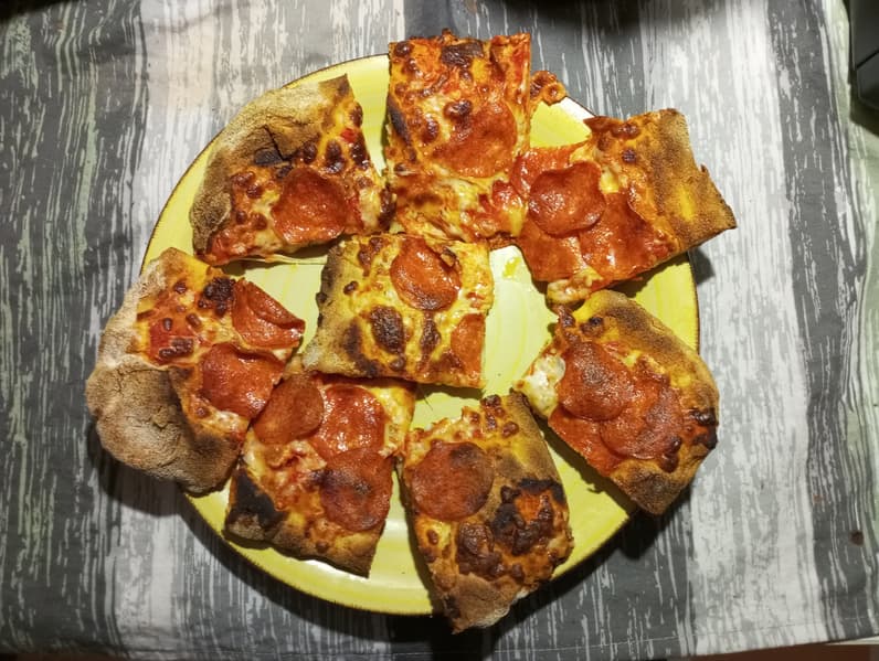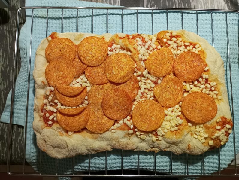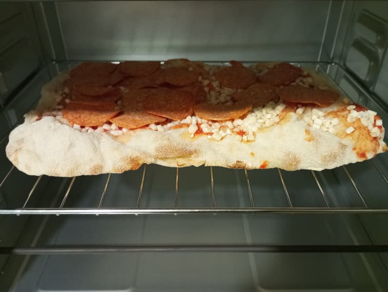 Мы воспользовались замороженным римским тестом для пиццы и заготовкой фирмы Zotman. Установили максимальную температуру на верхнем и нижнем тэнах при выключенном таймере. Мы хотели проверить скорость приготовления и замерить реальный температурный режим. До полной готовности прошло 7 минут.