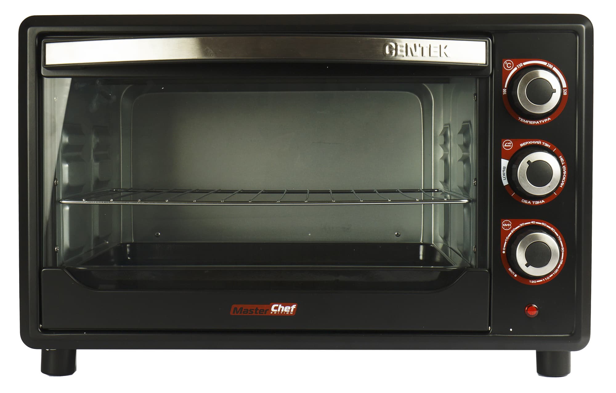 Мы уже упоминали, что в комплект Centek CT-1530-36 Black входят стальная хромированная жарочная решетка, легкая и узнаваемая, не очень глубокий металлический черный эмалированный противень и круглая форма для выпечки тоже черного цвета, диаметром 23 см. Кроме этого у шкафа есть специальный крюк для вынимания противня и решетки, очень приятное и комфортное изобретение.