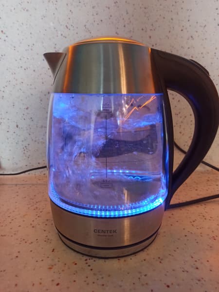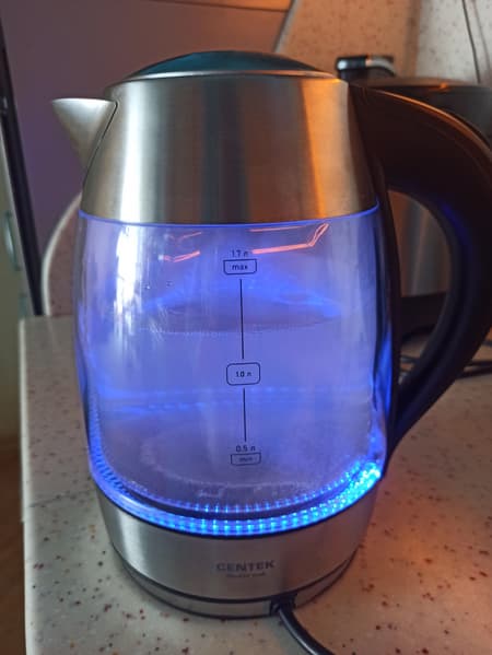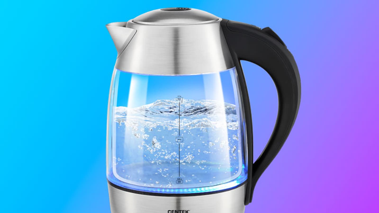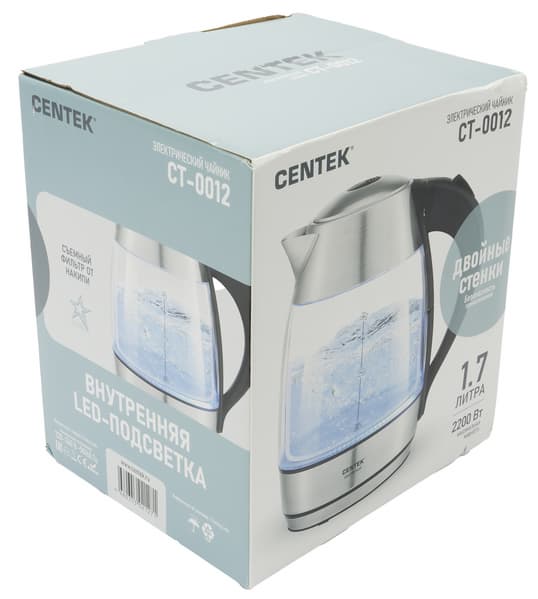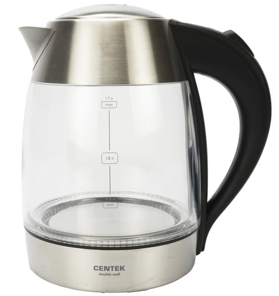 Сегодня в нашем обзоре незаменимый атрибут любой современной кухни — электрический чайник. Стеклянные электрочайники прочно вошли в современные тренды, и в данном случае мы имеем дело с красивым и модным кухонным прибором для нагрева воды. Серебристая матовая окантовка корпуса, черная матовая ручка и блестящая прозрачная колба вместе выглядят лаконично и стильно. А наличие светодиодной подсветки обещает превратить кипячение воды в доступное глазам зрелище со световым шоу. При этом у Centek CT-0012 двойные стенки, которые призваны улучшить термоизоляцию.