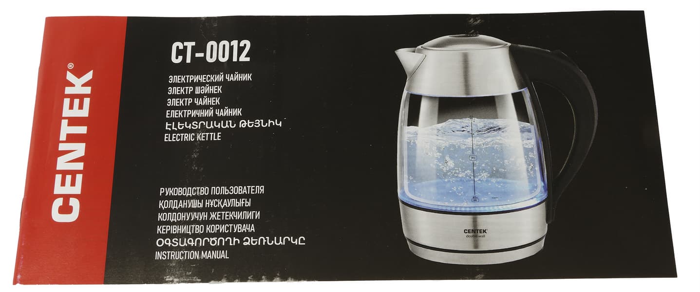 Электрический чайник фирмы Centek, модель CT-0012, прибыл к нам на тестирование в небольшой картонной коробке фирменного дизайна. На фронтальной части коробки фото чайника практически в натуральную величину, наименование фирмы-производителя, буквенно-номерное обозначение модели, также указан его объем (1,7 л) и максимальная мощность (2200 Вт).