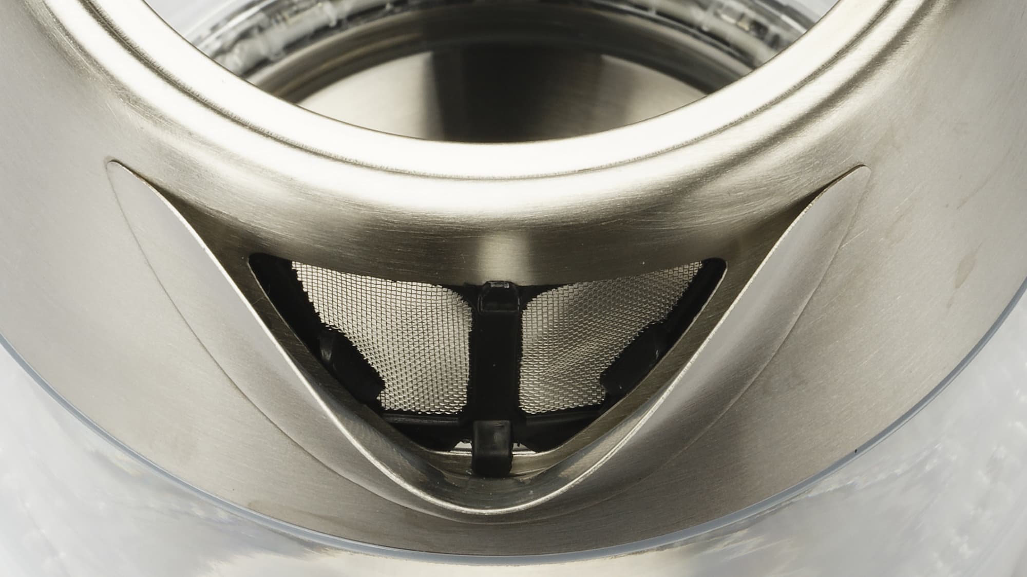 Верхняя часть корпуса над колбой и нижняя части, к которым сверху и снизу крепится ручка, выполнены из металла. Вверху корпуса расположен носик, через который мы будем выливать готовый кипяток из чайника. Он достаточно широкий, снабжен съемным фильтром-сеточкой от накипи.