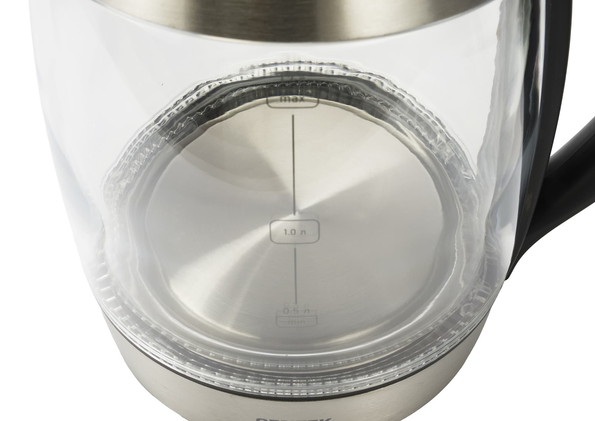 Колба чайника прозрачная стеклянная, вторая (внешняя) стенка выполнена из прозрачного пластика. Наличие двойных стенок у колбы чайника — важное отличие этой модели. Кроме того, в отличие от большинства других чайников с двойными стенками, эта модель лишена обычного недостатка — в ней возможно сразу увидеть какой объем воды залит. На стенке колбы нанесена градуировка — 0,5 л (минимум воды), 1,0 л и 1,7 л (максимальный объем воды). На дне колбы мы видим дисковый нагреватель из нержавеющей стали, а также лампы светодиодной подсветки по низу чайника под стеклом. Отметим, что вода в чайнике, нагреваясь, будет контактировать только с металлом и стеклом, считающимися наиболее безопасными для здоровья, будучи использованными в этих целях.