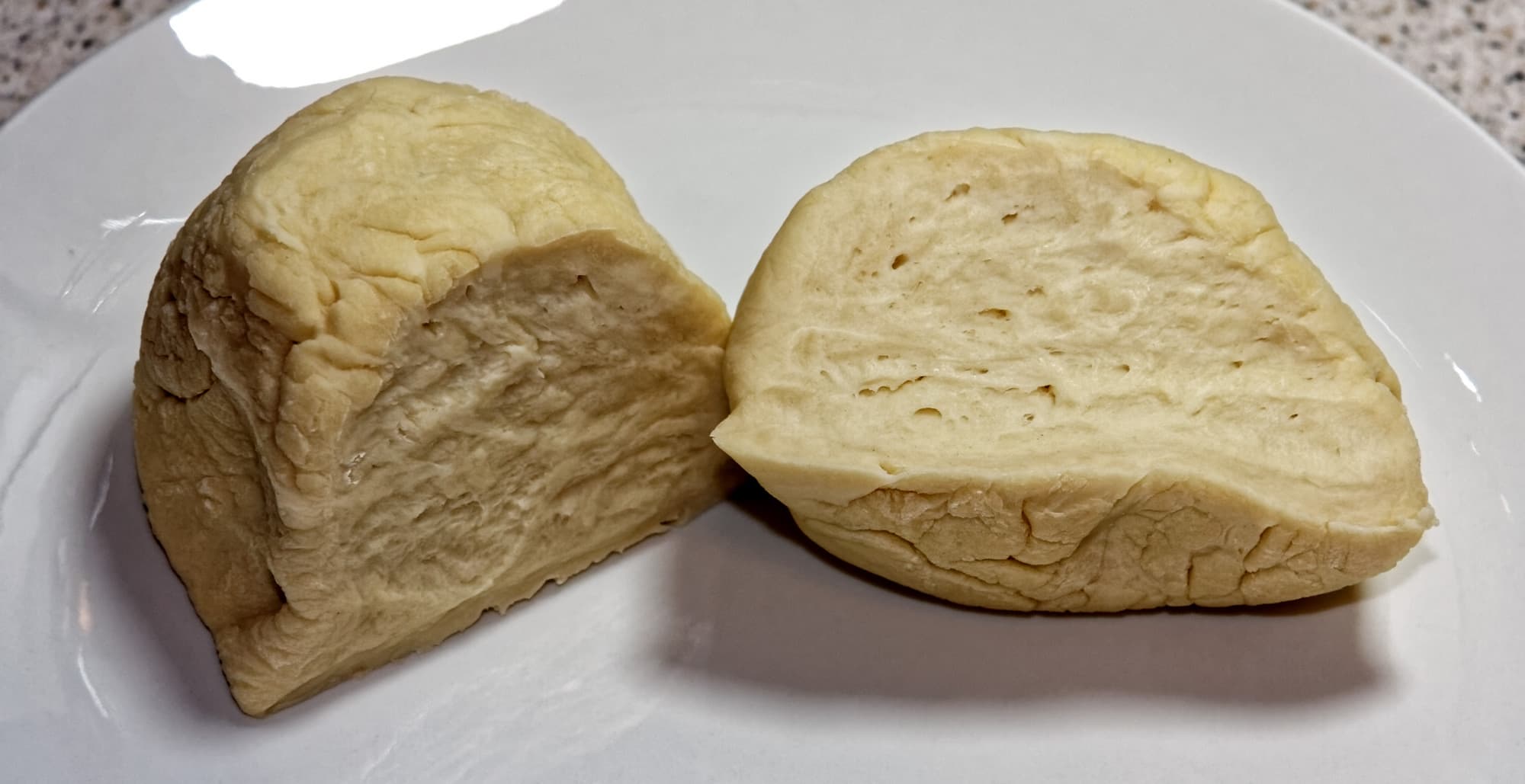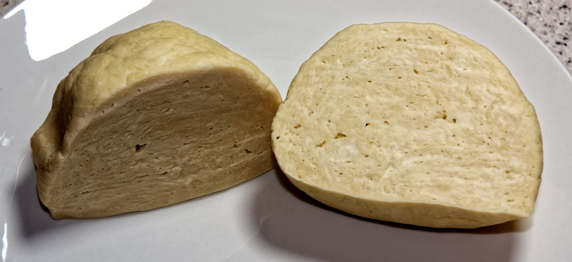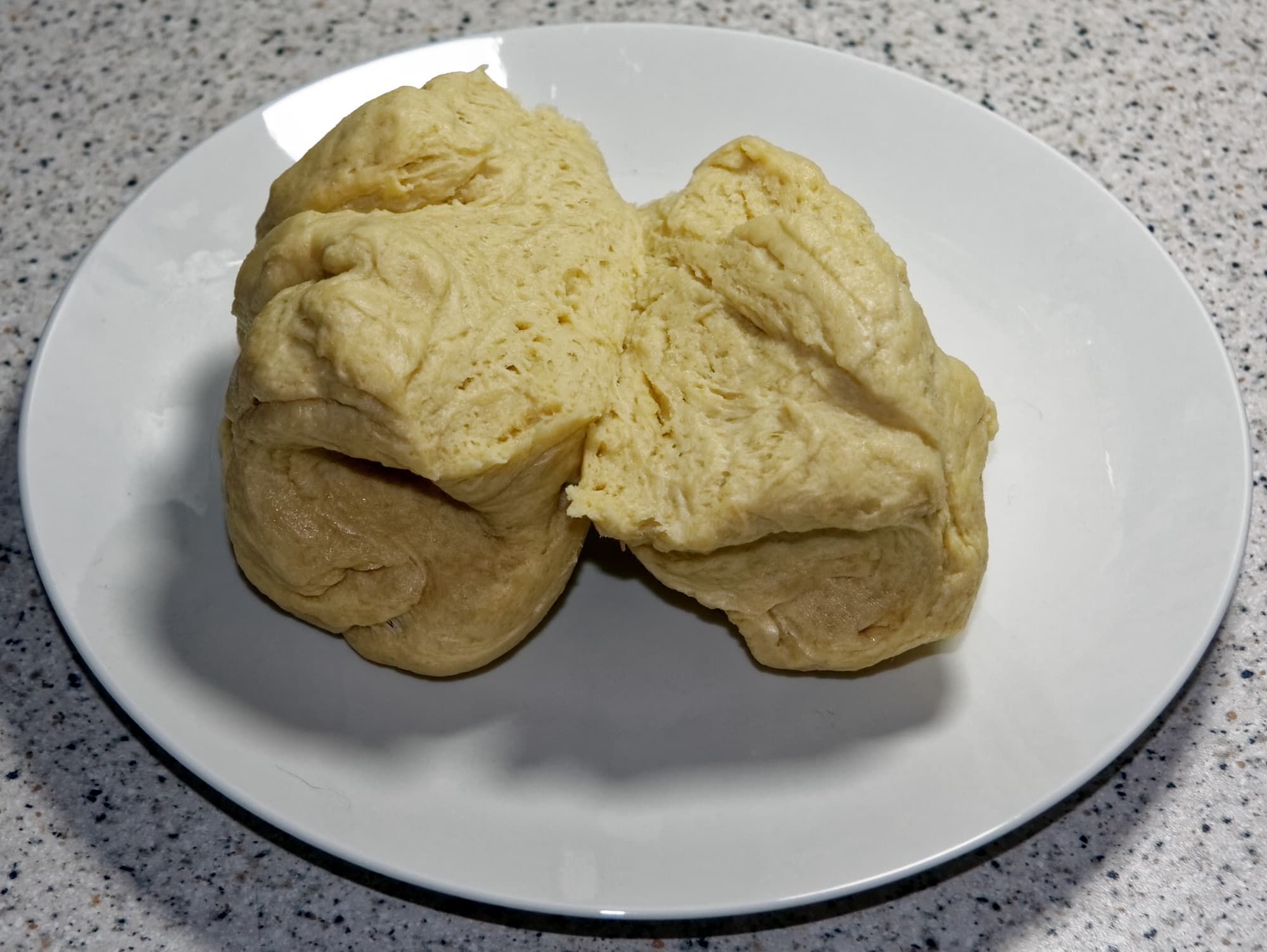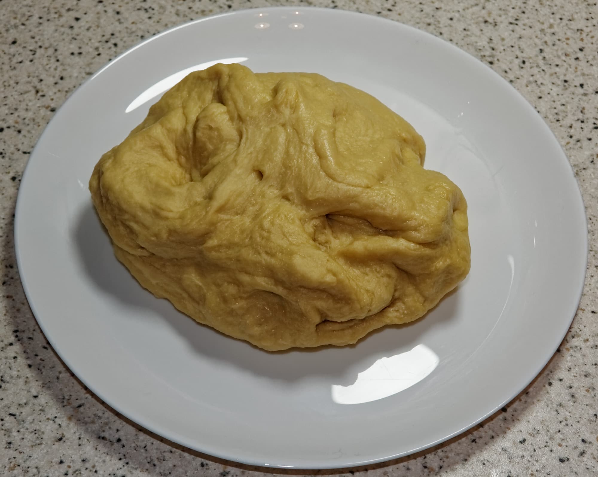 Когда горячее тесто остынет, вместе вымесить простое и заварное тесто до однородности. Завернуть в пищевую пленку и дать полежать еще 30-40 минут, после чего еще раз тщательно вымесить.
