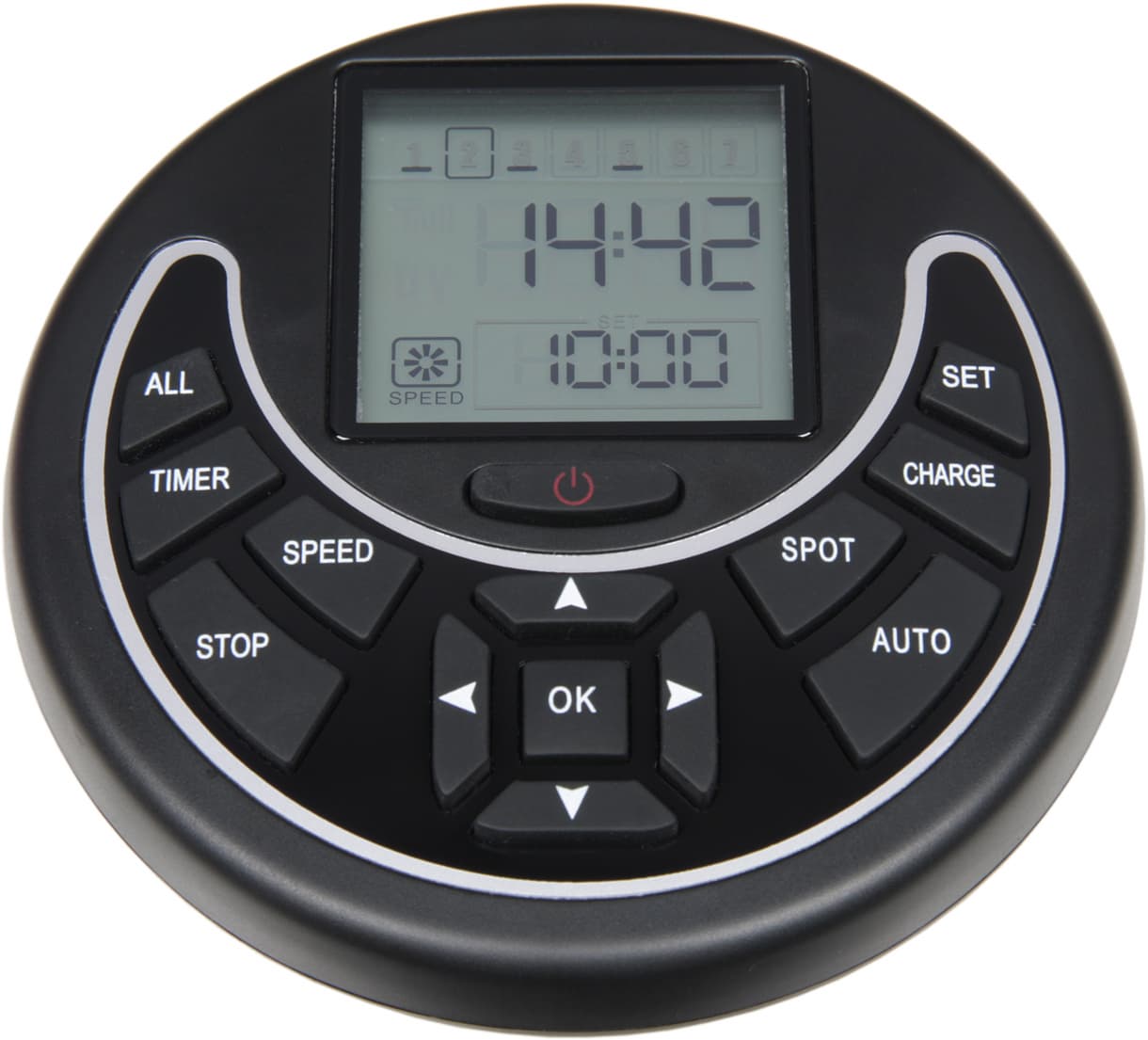На пульте есть кнопки из резиноподобного материала с читаемыми контрастными обозначениями и ЖК-дисплей, работающий на отражение. Дисплей достаточно информативный — выводится текущее время и день недели, время автоматического запуска и отмеченные дни недели (подчерком под цифрами), режим работы и при передаче сигнала мигает значок антенны.