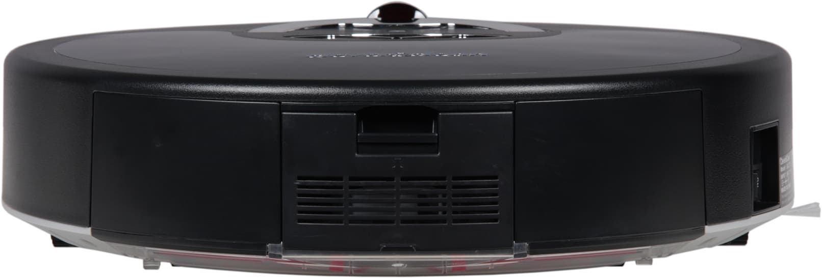 За окошками находятся излучатели и приемники ИК-излучения, исполняющие роль датчиков приближения. Пупырышки смягчают удар о препятствие (которое не обнаружили ИК-датчики), а также работают в качестве контактных датчиков столкновения. Точно по центру спереди расположены подпружиненные контакты, обеспечивающие зарядку на базе. Выше — датчик парковки на базу, а еще выше, уже на верхней панели — обзорный выступающий вверх ИК-датчик, который собственно и определяет минимальную высоту просвета предметов обстановки, под которые пылесос еще может забраться. На левом боку ничего интересного. На правом, ближе к задней части находятся разъем питания для зарядки минуя базу, и клавиша выключения.
