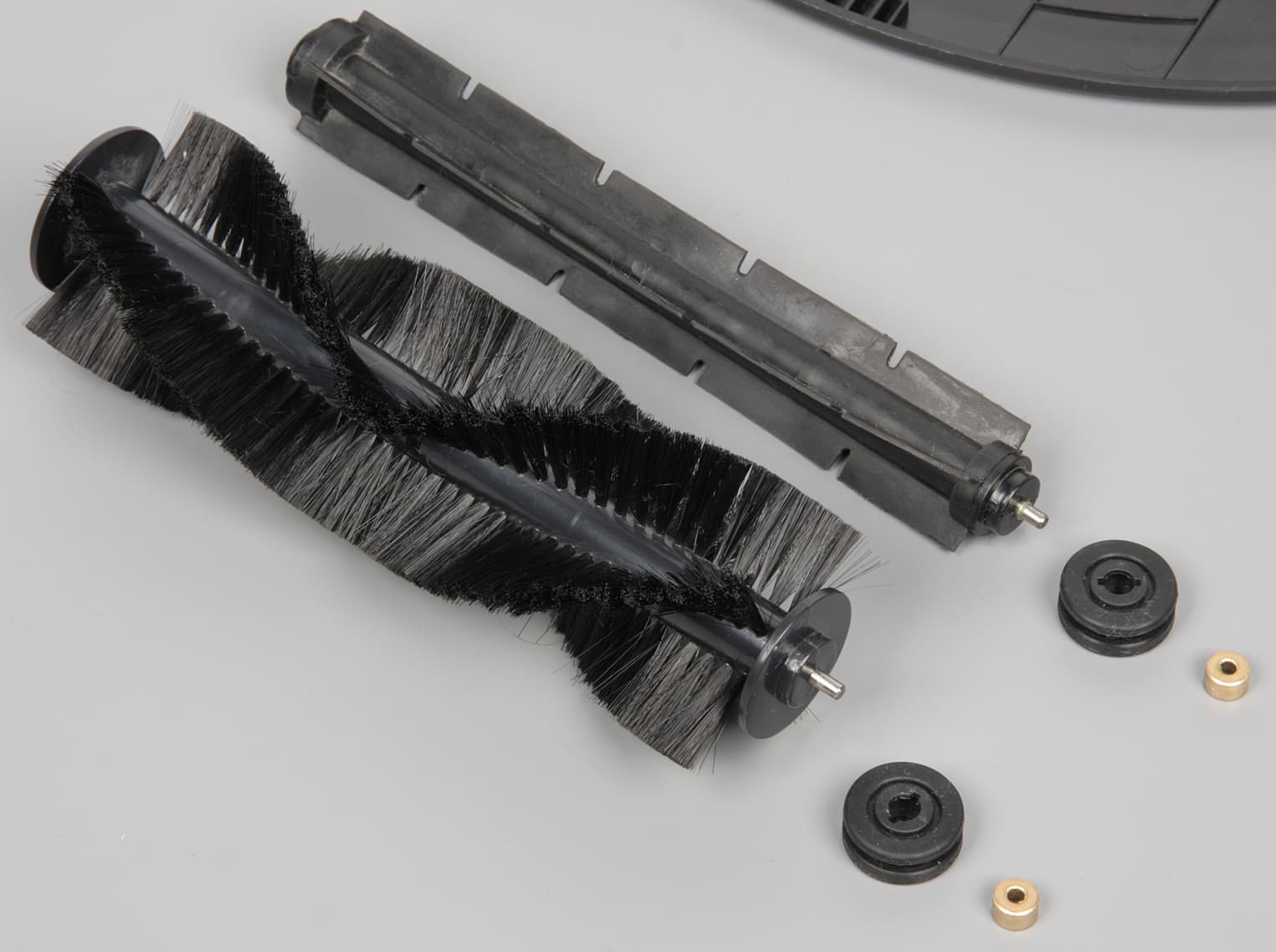 Щетина на большой щетке мягкая, а ее пучки идут волнами, что уменьшает звук от вращения щетки в контакте с полом. Стальные оси в торцах щеток вращаются в подшипниках скольжения в виде бронзовой втулки. Это правильное конструктивное решение, так как подшипники качения в этом узле рано или поздно заклинивает, из-за намотавшихся на сепаратор волос, шерсти и прочего. Подшипники установлены во втулки из мягкой резины, что снижает вибрацию и шум.