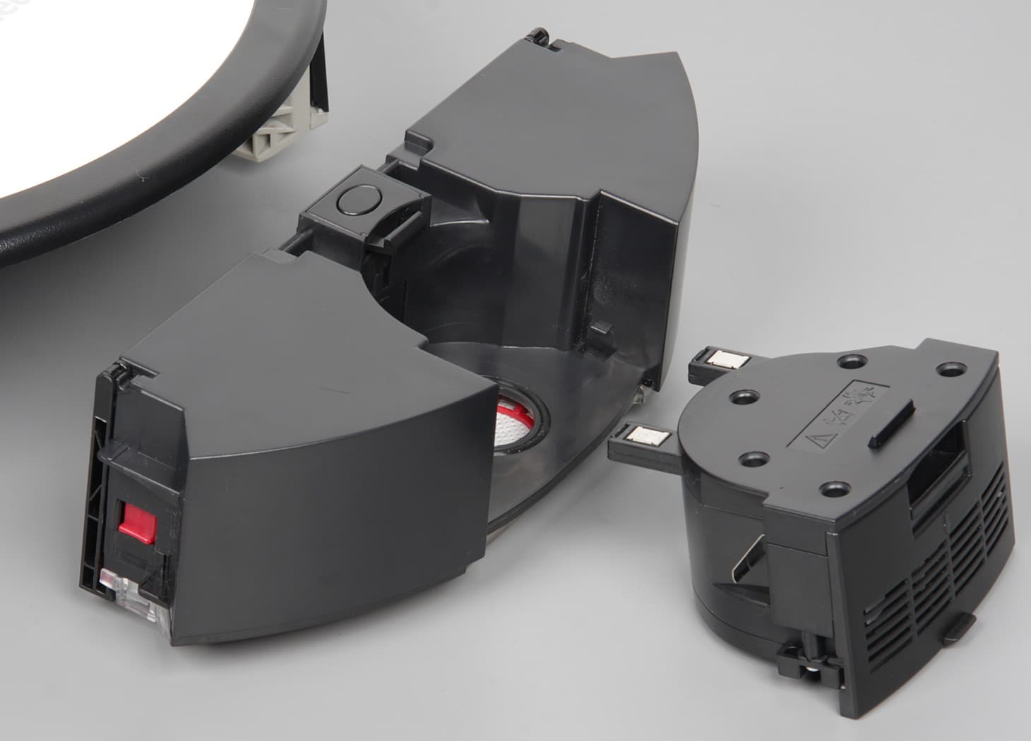 Корпус робота изготовлен из пластика с матовой поверхностью и без покрытия. Сверху и с боков корпус черный, а днище — светло-серое. На верхнюю панель наклеена белая накладка из тонкого пластика. Белый цвет облегчает поиск робота в темных закоулках квартиры, когда он по какой-то причине не вернется на базу, также робота проще заметить боковым зрением, когда он путается под ногами, а значит, с меньшей вероятностью на него можно наступить.