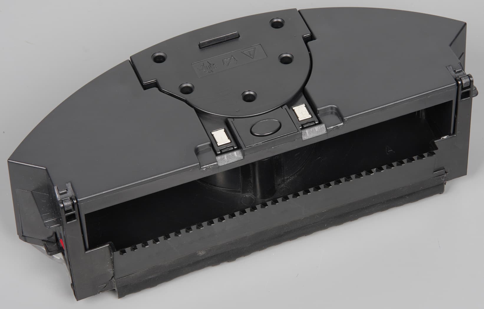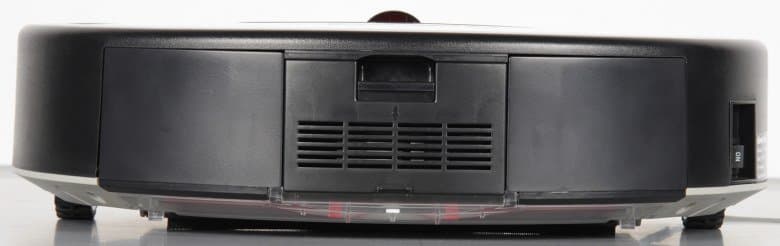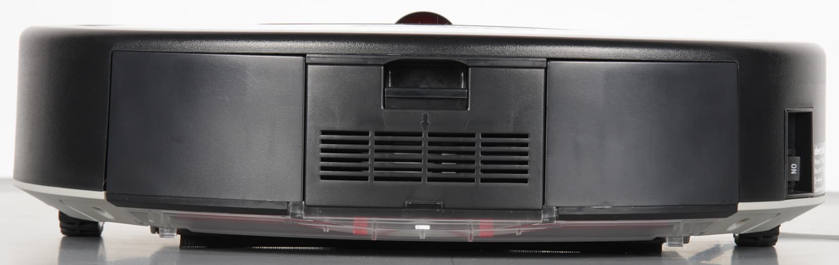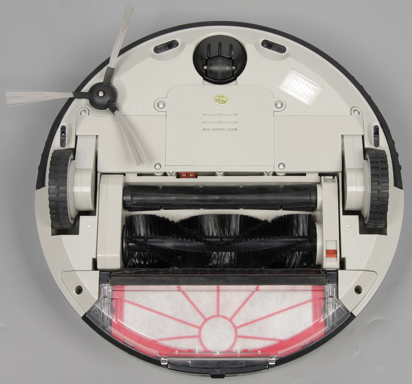 На днище расположены передний опорный поворотный ролик, боковая щеточка, крышка батарейного отсека, два ведущих колеса, отсек основной щетки. Ближе к краю сразу за бампером расположены четыре ИК-датчика перепада высоты, благодаря которым робот-пылесос может избежать падения со ступенек.