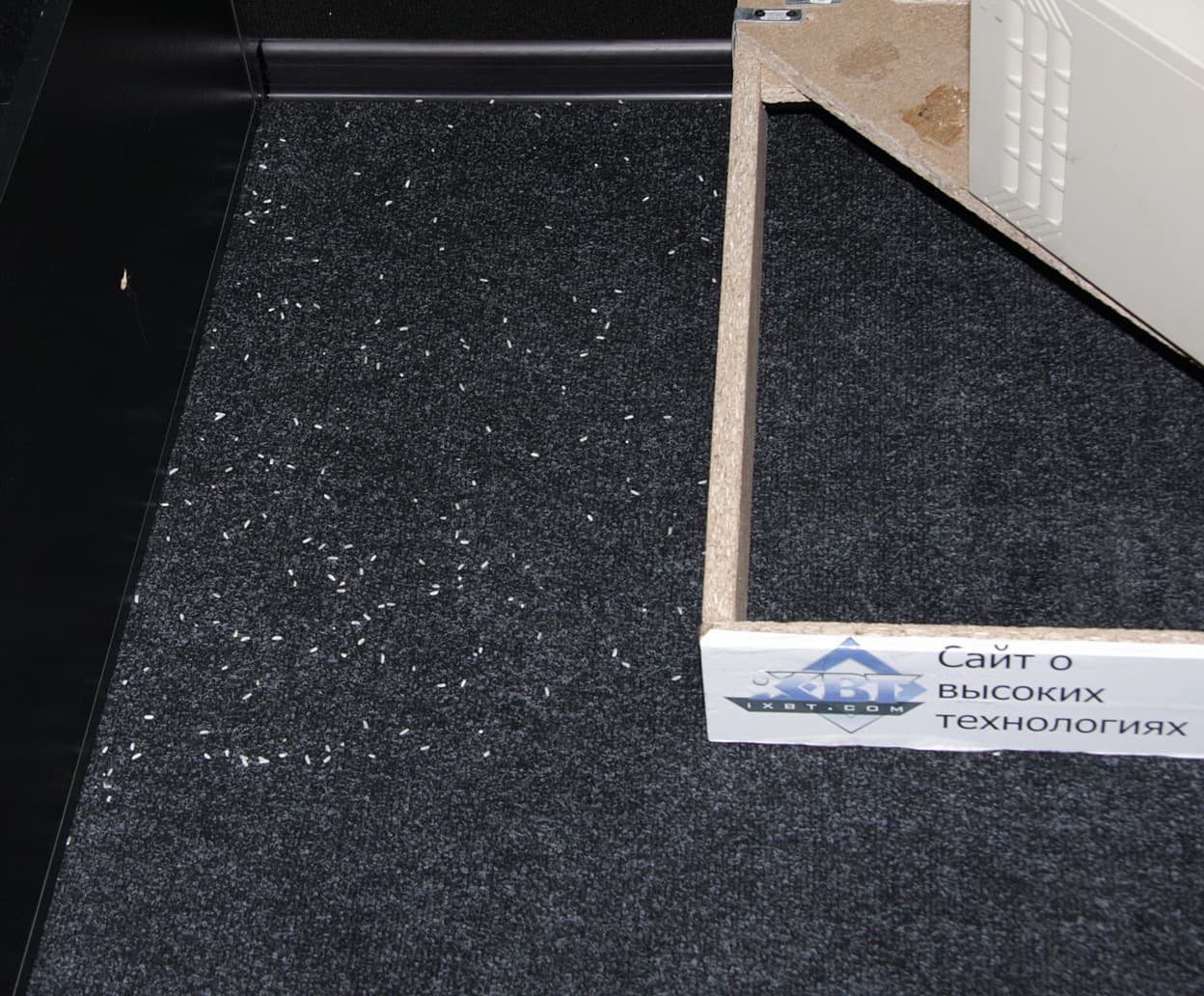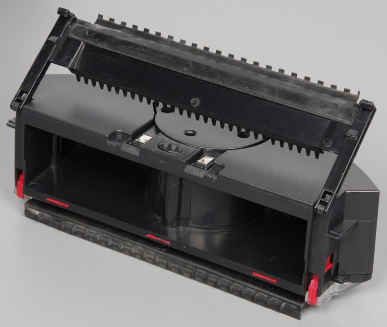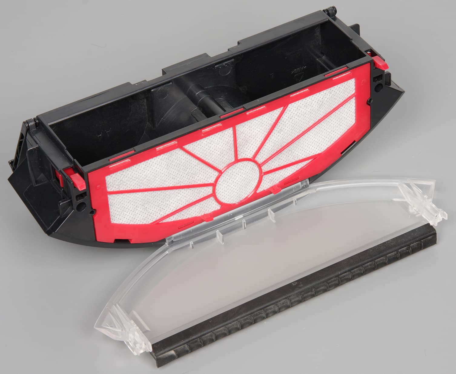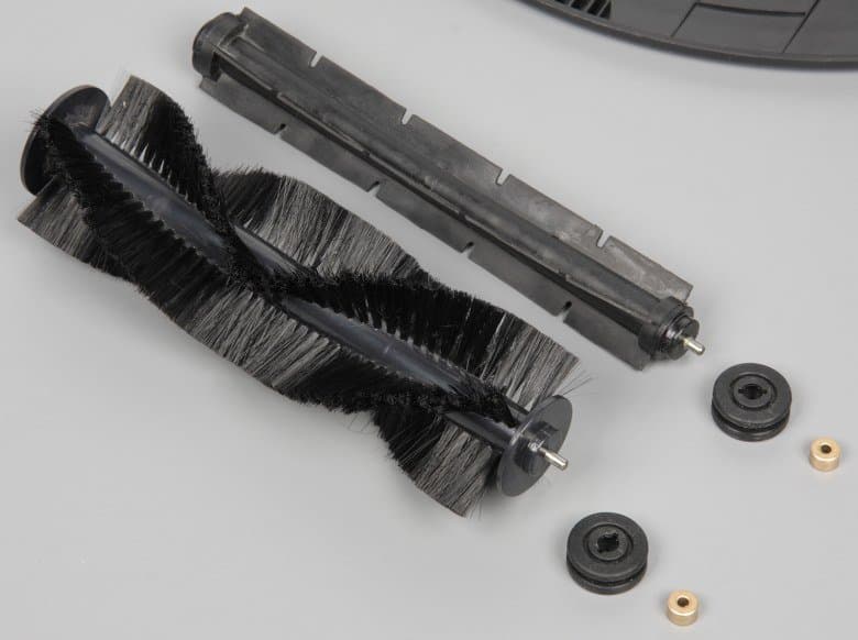 Отсек, в котором находятся основные щетки, закреплен на шарнире, поэтому с ходом примерно в 6 мм он следует рельефу пола. Щетка-скребок выступает за боковые направляющие примерно на 1-2 мм, а щетина второй щетки выступает на 4 мм. В итоге достигается хорошая эффективность работы щеток на неровных поверхностях с практически любым типом покрытия. Для очистки щетки вынимаются из отсека.