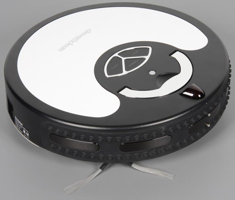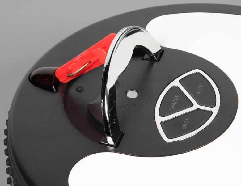 Сверху есть небольшая дугообразная ручка из пластика с хромированной поверхностью, приподнимающаяся на пару сантиметров, за которую пылесос удобно переносить. В центральной части верхней панели располагаются три механические кнопки с подсвечивающимися синим цветом надписями, а перед ними — матовый кружок индикатора состояния с красной подсветкой. Надписи на кнопках подсвечиваются только тогда, когда робот находится в соответствующем состоянии. Дополнительно о своем состоянии робот информирует с помощью коротких и относительно громких звуковых сигналов. Отключить звуковое оповещение нельзя.