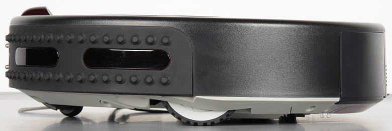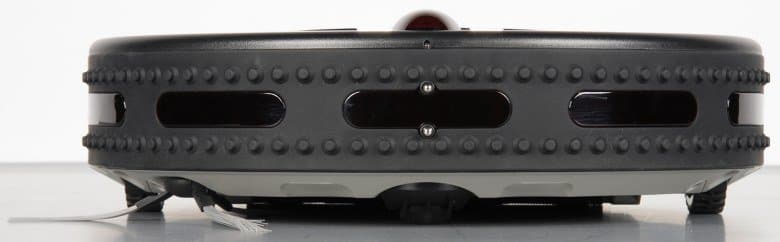 За окошками находятся излучатели и приемники ИК-излучения, исполняющие роль датчиков приближения. Пупырышки смягчают удар о препятствие (которое не обнаружили ИК-датчики), а также работают в качестве контактных датчиков столкновения. Точно по центру спереди расположены подпружиненные контакты, обеспечивающие зарядку на базе. Выше — датчик парковки на базу, а еще выше, уже на верхней панели — обзорный выступающий вверх ИК-датчик обнаружения базовой станции и виртуальной стены. Этот датчик определяет минимальную высоту просвета предметов обстановки, под которые пылесос еще может забраться.