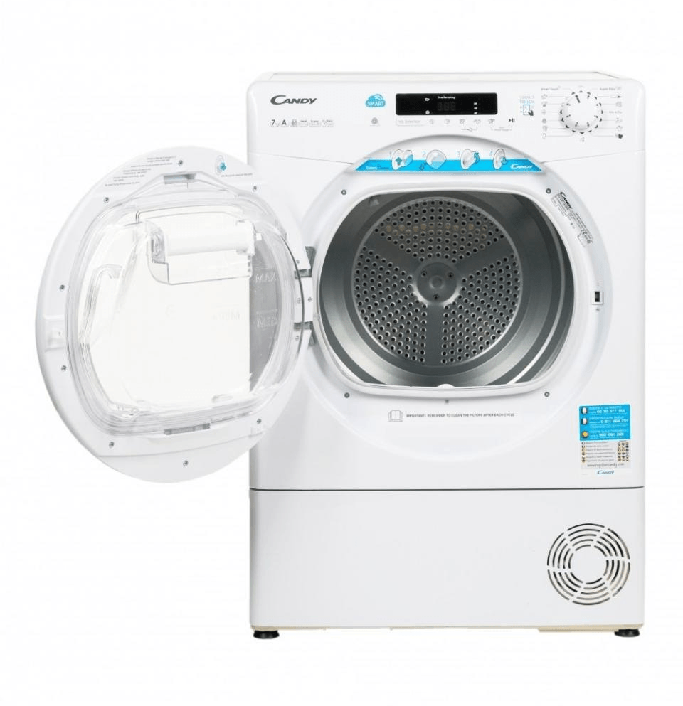 Наиболее современные сушильные машины оснащены тепловым насосом — специальным устройством для охлаждения воздуха, прошедшего через барабан с бельем. То есть, по сути, компактным холодильным аппаратом.