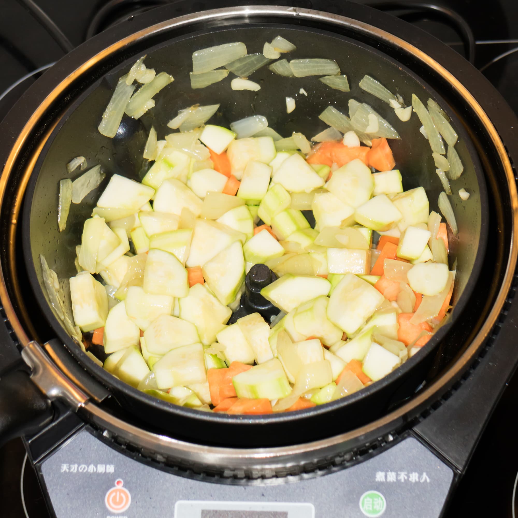 Нагрели кастрюлю с перемешивателем, добавили масло, включили программу stir-fry в первом режиме. Помня о долгой обжарке в первом опыте, сразу установили 20 минут. Лук добавили через две минуты после начала процесса — ждали, пока хорошо разогреется масло. На фотографии можно увидеть лук через 5 минут после обжаривания. Лук никак не изменил свой цвет.