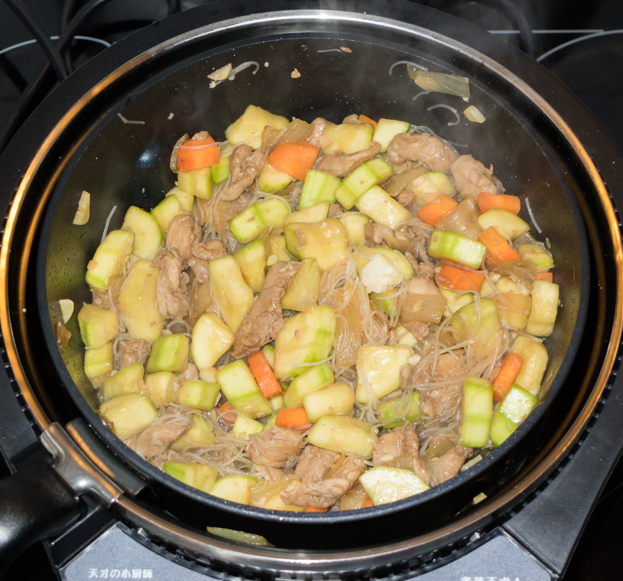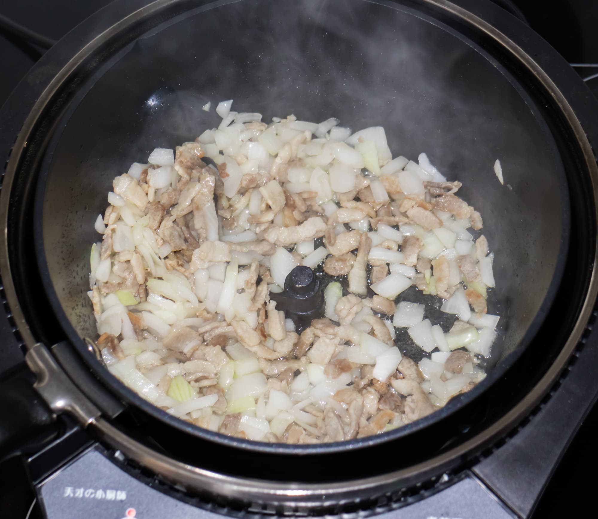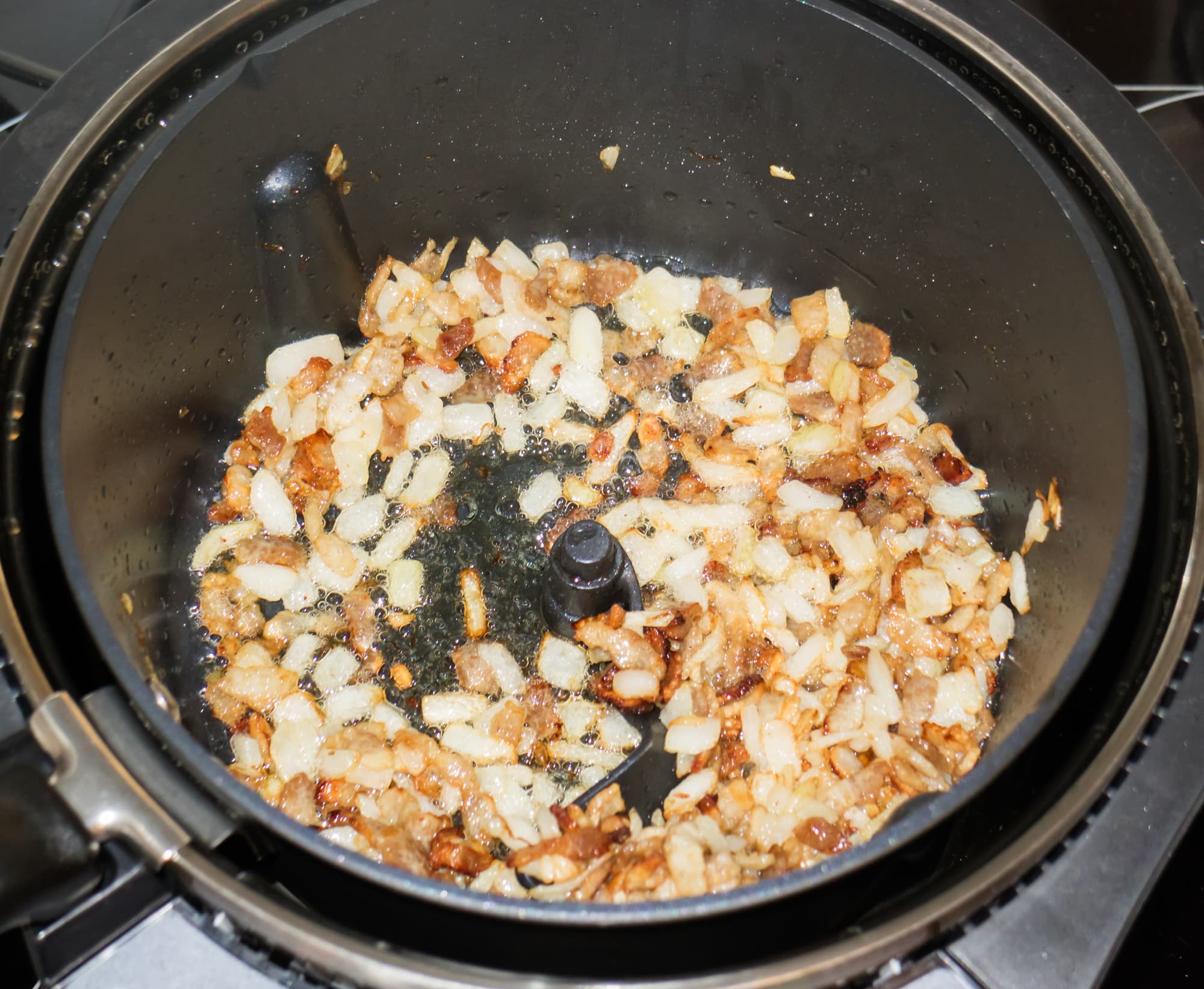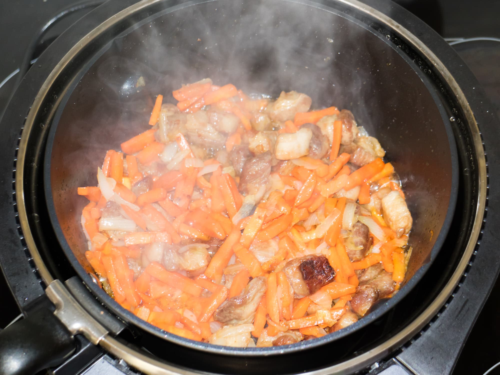 Затем установили в прибор кастрюлю с перемешивателем и приступили ко второму этапу — обжарке овощей, свиной грудинки и яиц.