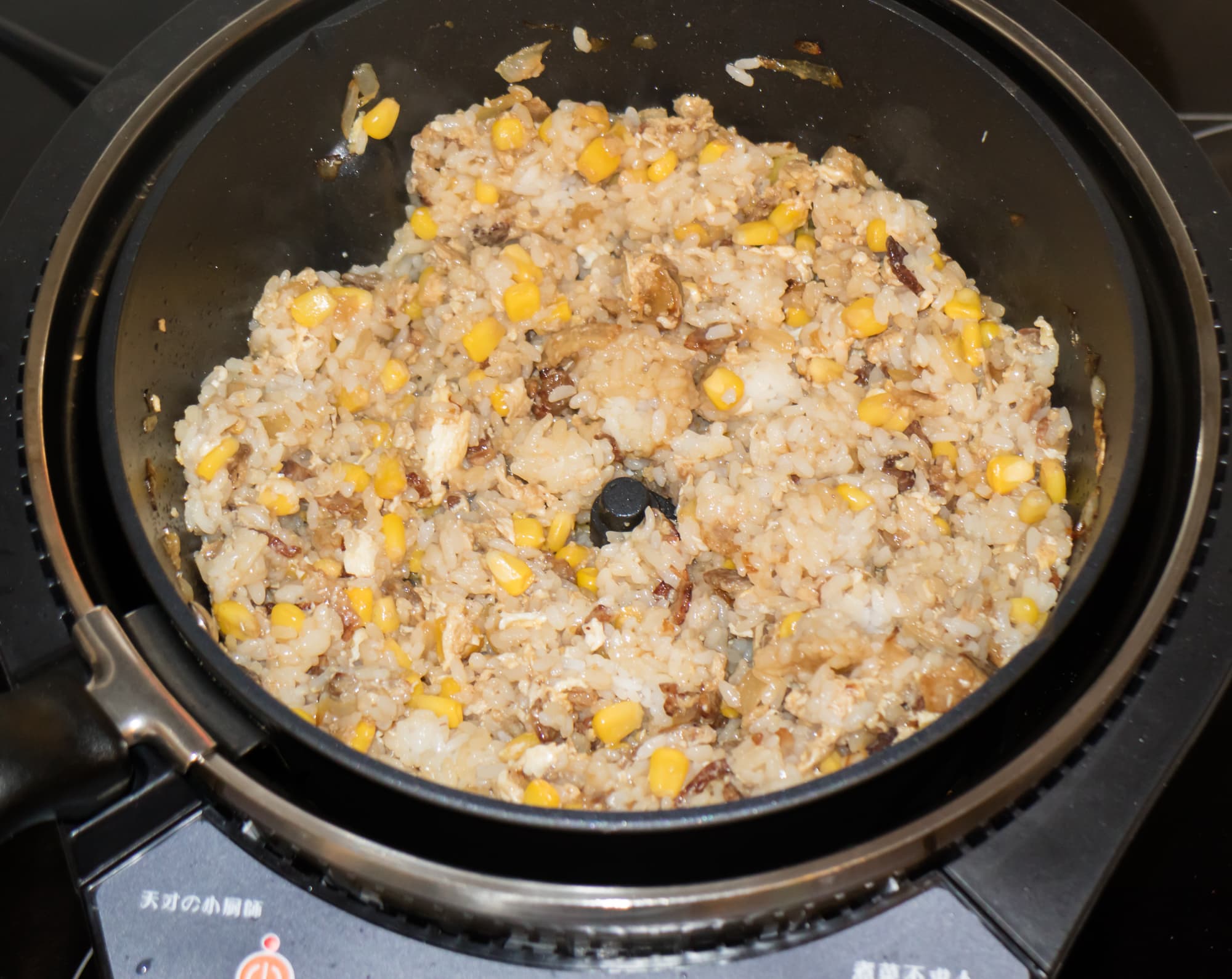 Обжаривали ее буквально пару минут, потом влили яйца. Когда яйца «схватились», добавили рис и немного соевого соуса. Через несколько минут жарки и перемешивания рис прогрелся и достаточно равномерно смешался со всеми остальными ингредиентами.