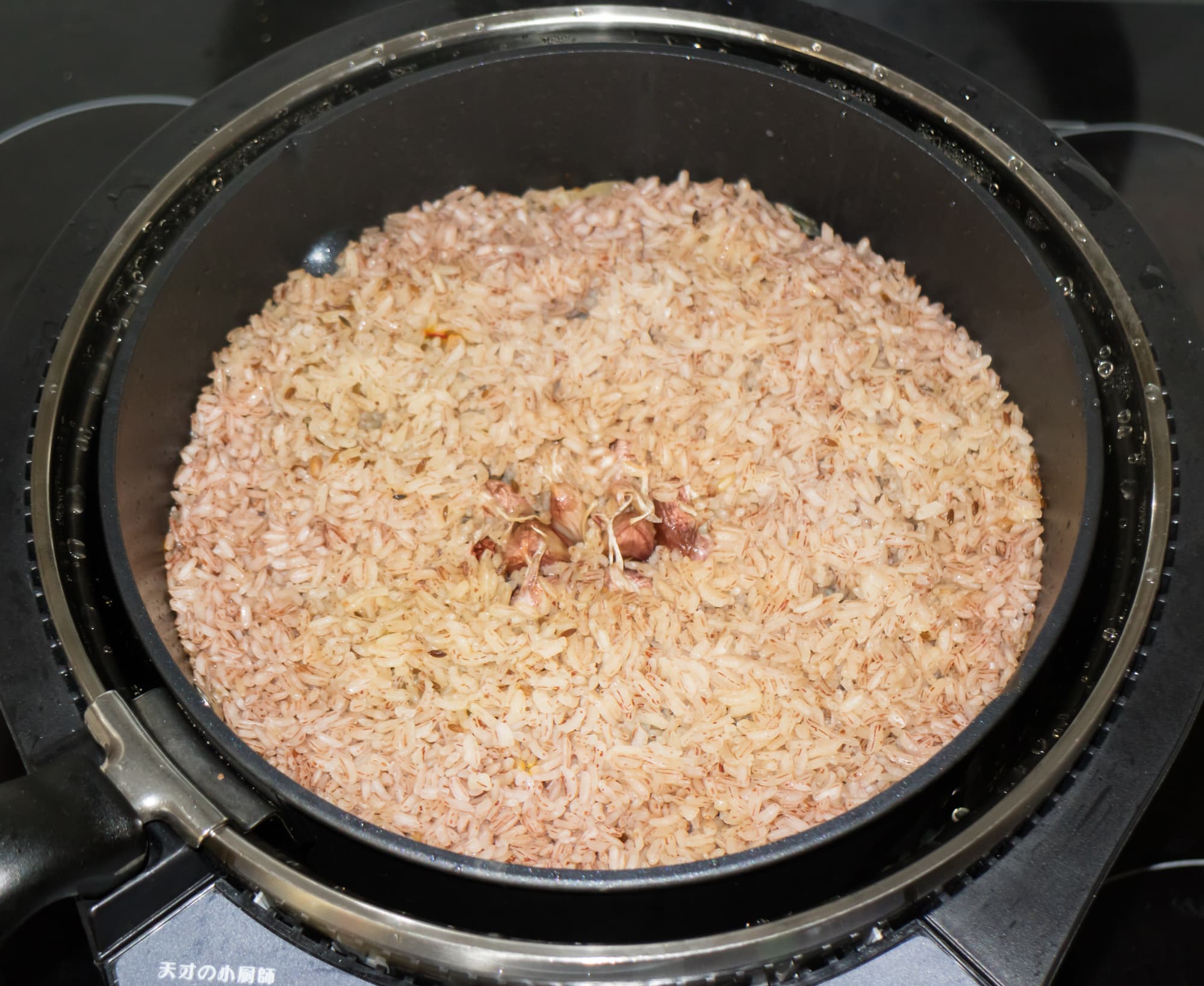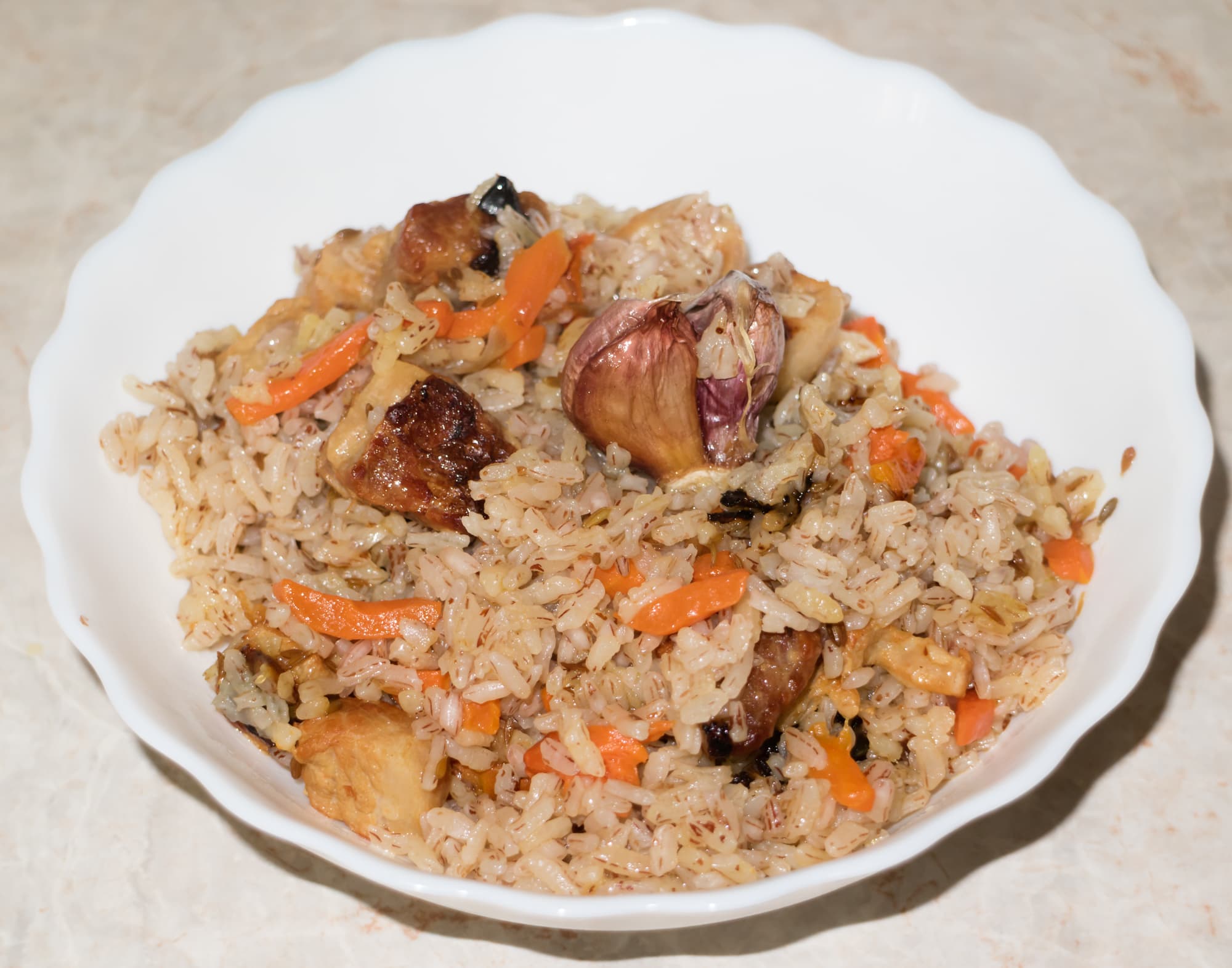 Когда морковь немного пожарилась, добавили зиру, чтобы она ароматизировала масло. Через пару минут влили воду, посолили, добавили шафран. После закипания отключили нагрев, дали зирваку несколько минут потушиться и настояться. Затем добавили рис, еще немного воды, в центр закопали головку чеснока.