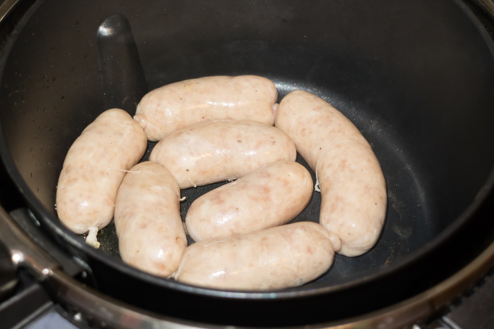 Мощность режима жарки оказалась достаточной, чтобы быстро и качественно поджарить домашние свиные сардельки. Совсем необязательно было пользоваться микроволновой печью. Можно было бы просто оставить сардельки минут на пять под закрытой крышкой по завершении времени жарки. Думаем, что под действием жара от стенок и дна кастрюли мясо дошло бы до нужной степени готовности.