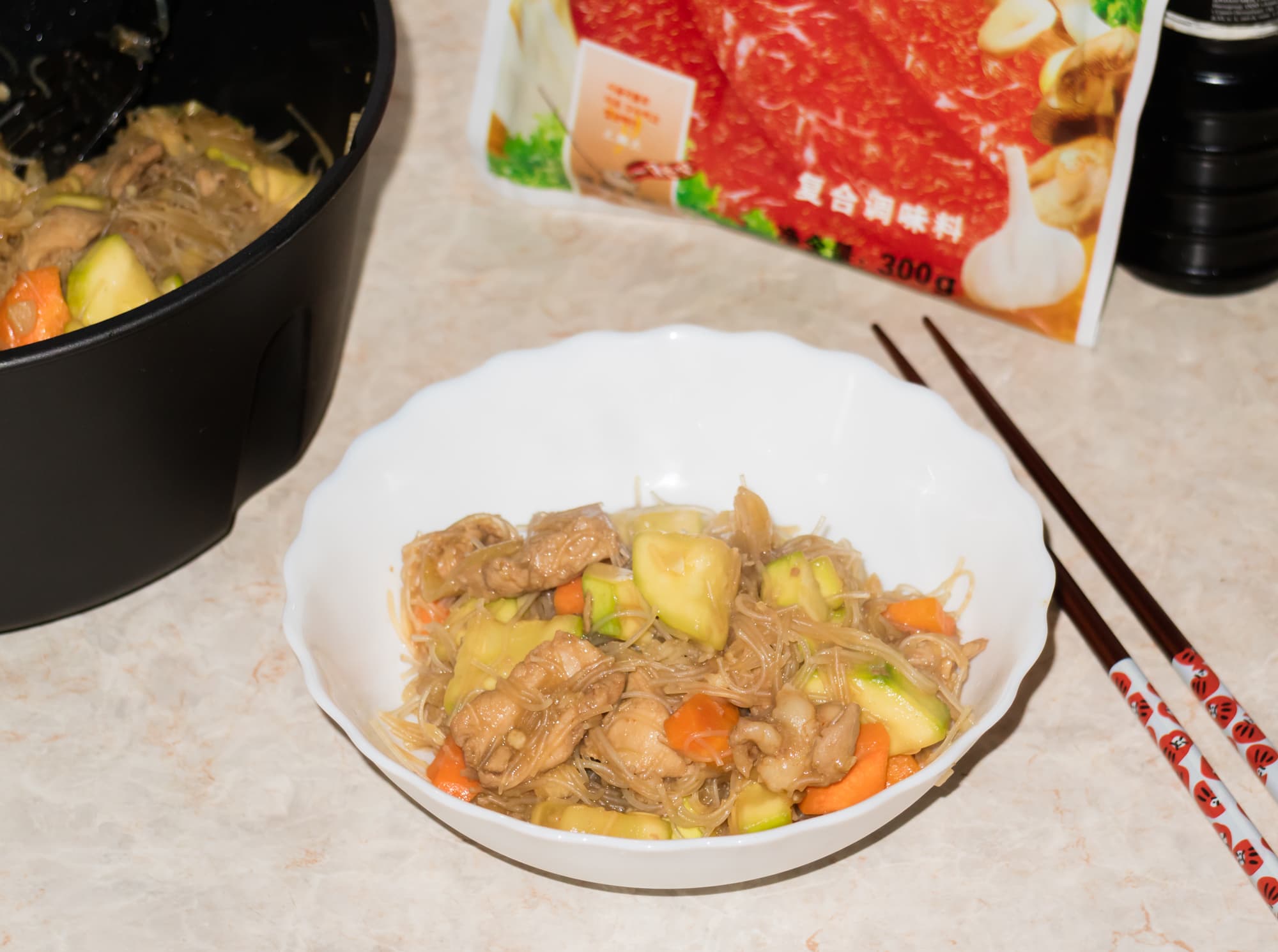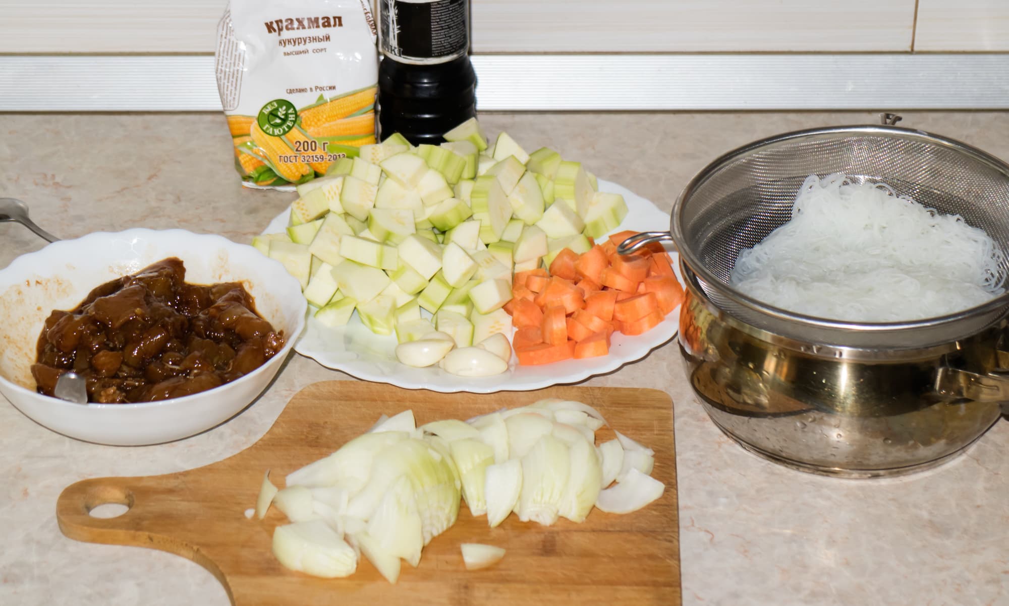 Это блюдо относится к разряду большого ассортимента блюд, которые мы емко называем «китайщина». Все они отличаются большим количеством овощей (любых), небольшими кусочками мяса или курицы (можно предварительно мариновать, можно — нет) и быстрой обжаркой. В этот раз мы взяли: репчатый лук, морковь, кабачки, куриную грудку, чеснок и фунчозу. На крахмал мы посмотрели и убрали назад в шкаф — при фунчозе он не очень нужен.