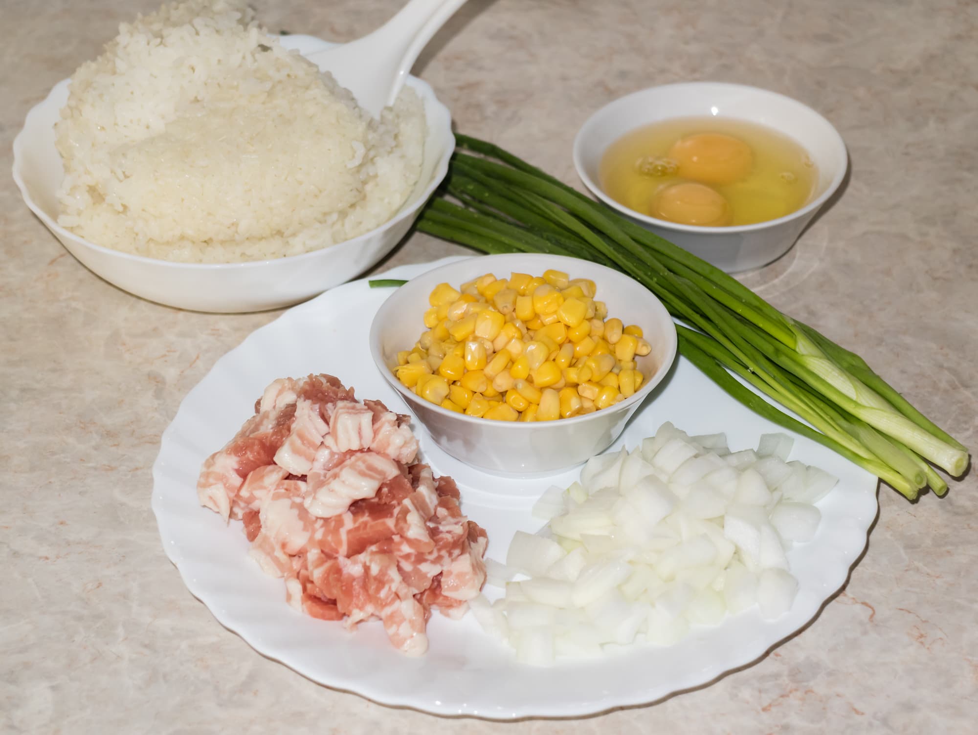 На полную с горкой тарелку риса взяли половину луковицы, треть банки консервированной кукурузы, два яйца и граммов 200 мелко нарезанной грудинки. Сначала поместили в кастрюлю грудинку. Минут через 8, когда жир вытопился, а кусочки грудинки слегка поджарились, добавили лук.