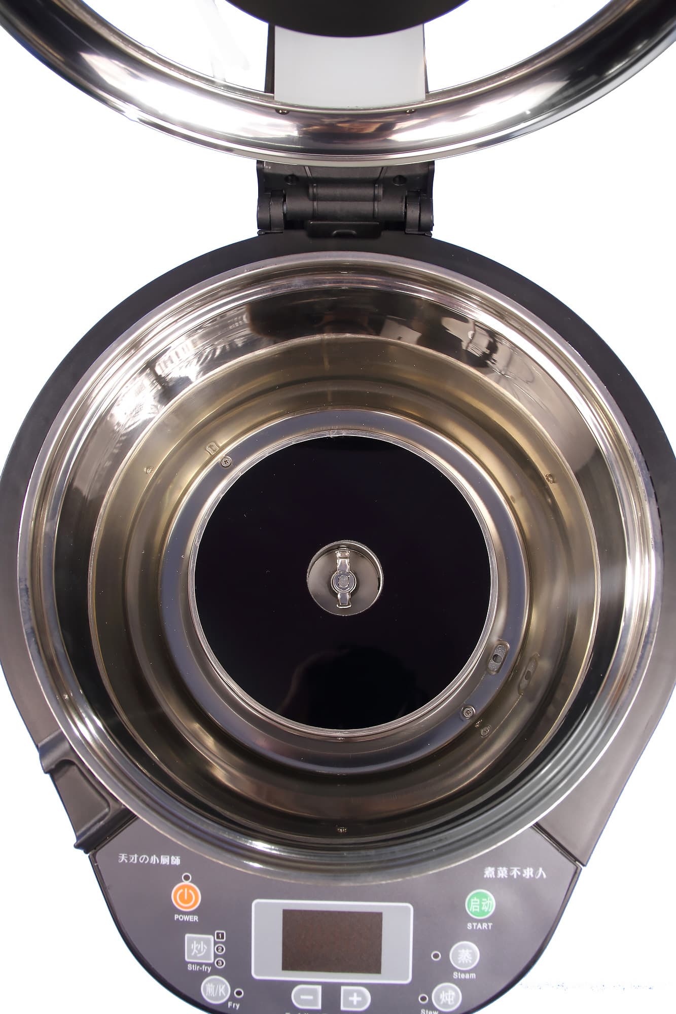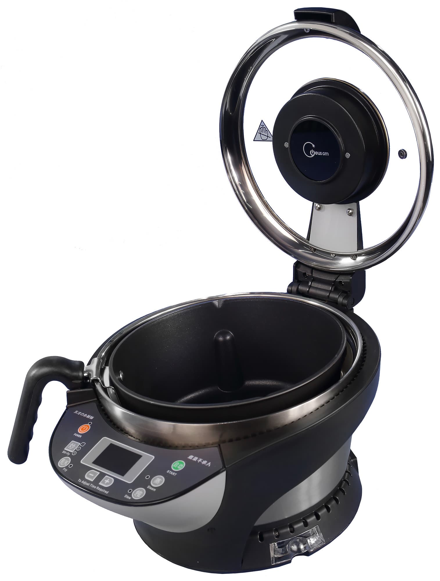 Внутрь прибора вставляется чаша с лопастью для перемешивания или альтернативная чаша без оной. По умолчанию в приборе размещается чаша для стир-фрая. Кастрюли изготовлены из алюминия. С внутренней стороны обработаны антипригарным покрытием. Лопасть для перемешивания также с антипригарной поверхностью. Лопасть относительно большого размера (высота в самой высокой точке 3 см, длина — 9 см) свободно вращается. Ручка кастрюли является несъемной. С внешней стороны кастрюли на дне можно увидеть три небольших упора для установки и два упора для механизма перемешивания.