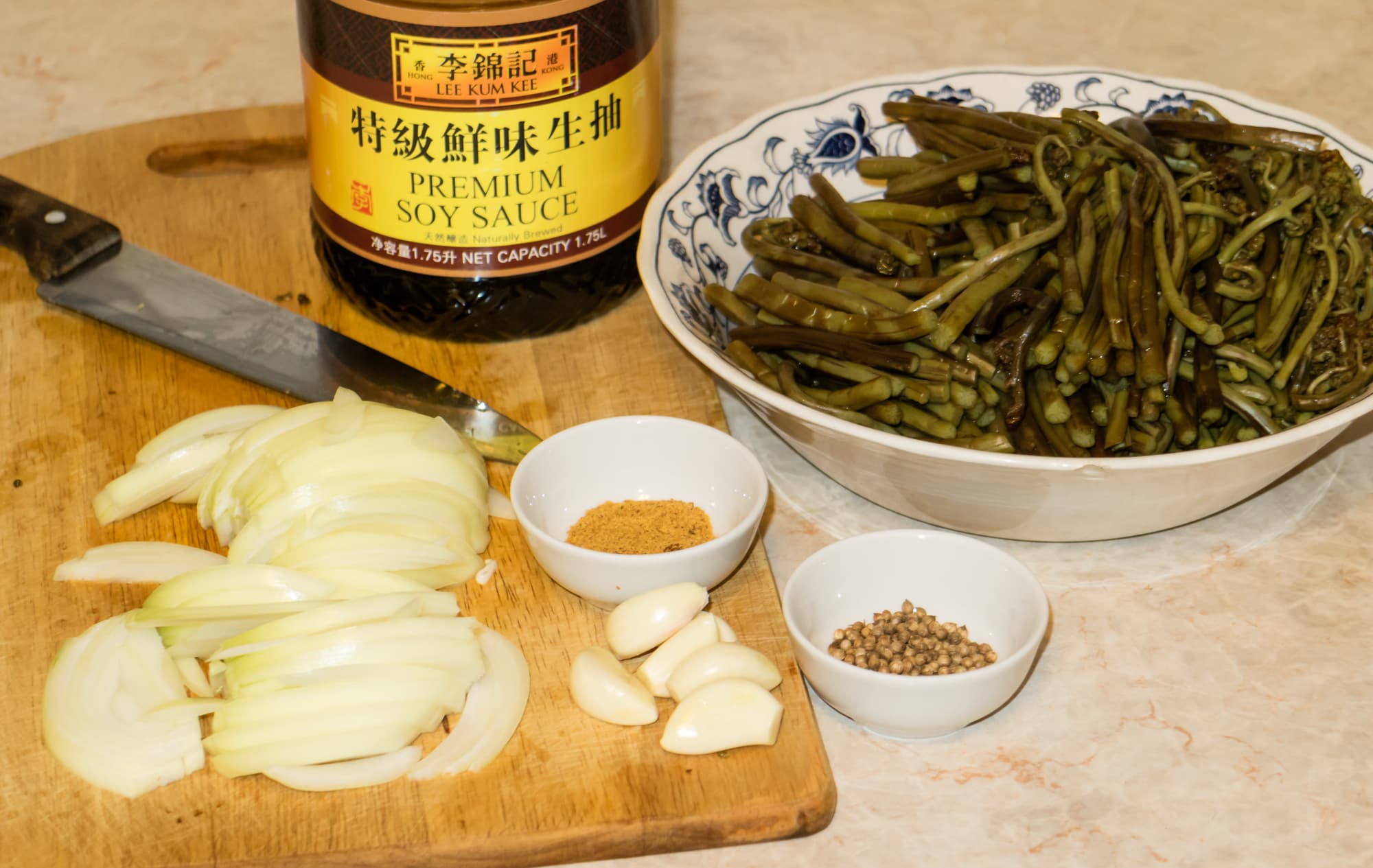 Соленый папоротник — 500 г, лук репчатый — 1 шт., чеснок, масло растительное, соевый соус, молотый кориандр, острый красный перец — по вкусу.