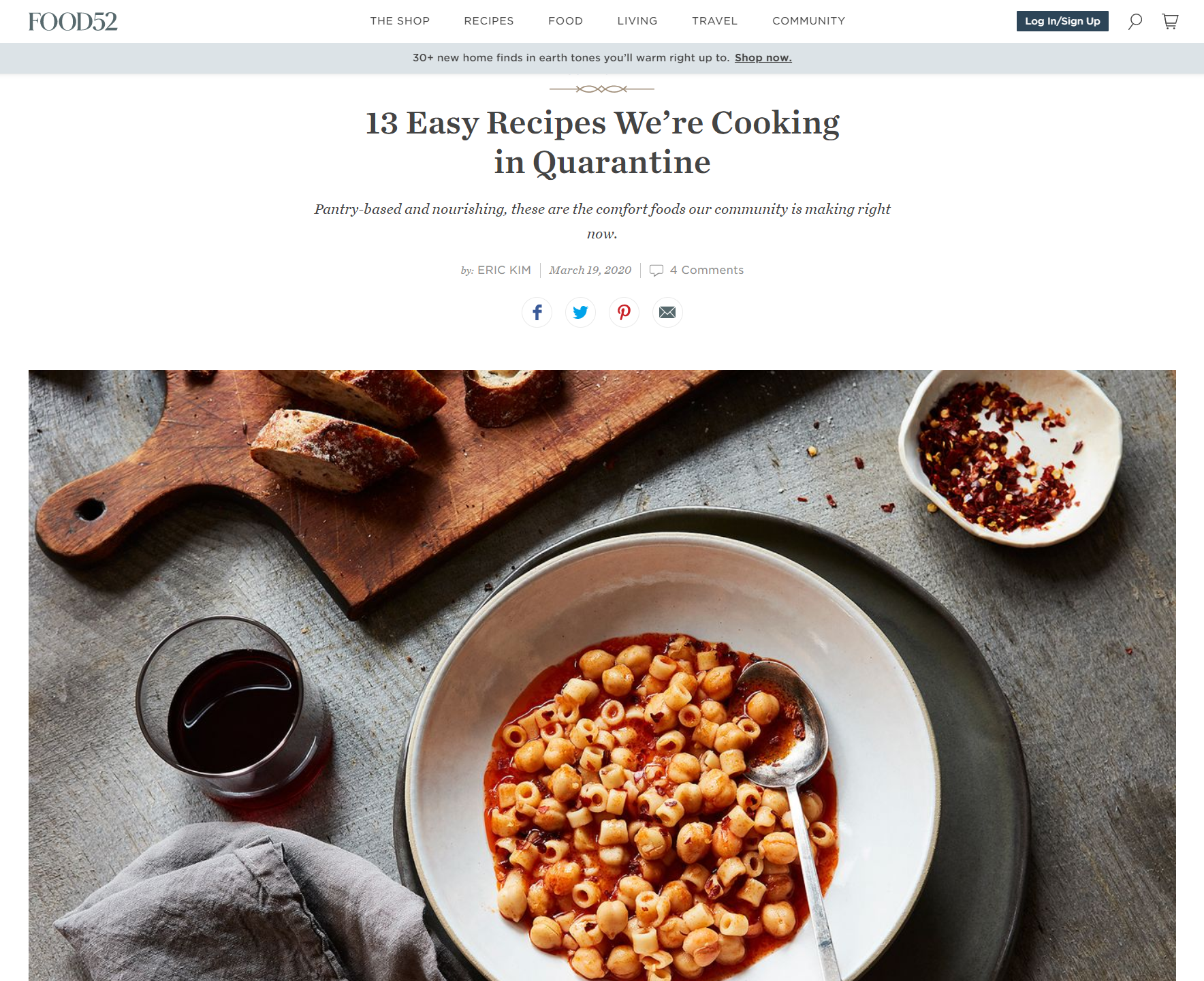 Рецепты New York Times для тех, кто находится на карантине: лапша и бутерброды, хумус и карбонара, много фасоли и печеньки, которые не нужно печь, рецепты на случай, если у вас нашлась банка консервированного тунца, и завтраки за 10 минут — отличная подборка на все случаи жизни.
