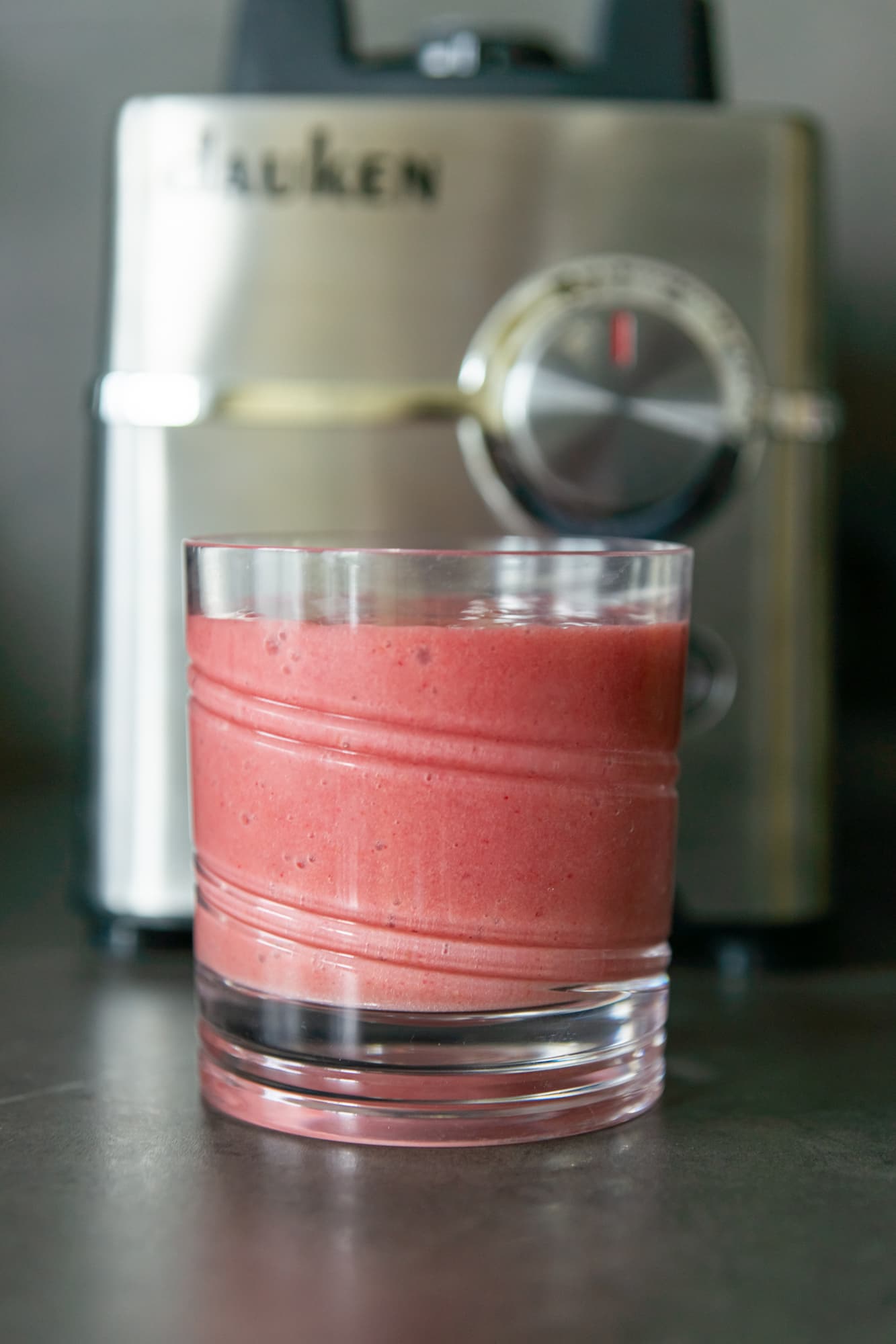 Ягод и бананов в кувшин поместили 50/50, подлили около 100 мл 20%-ных сливок и запустили устройство в авторежиме Смузи. Через 45 секунд масса в кувшине смотрелась уже совсем готовой. Мы остановили блендер, заглянули под крышку и обнаружили-таки на дне одну целую ягоду.