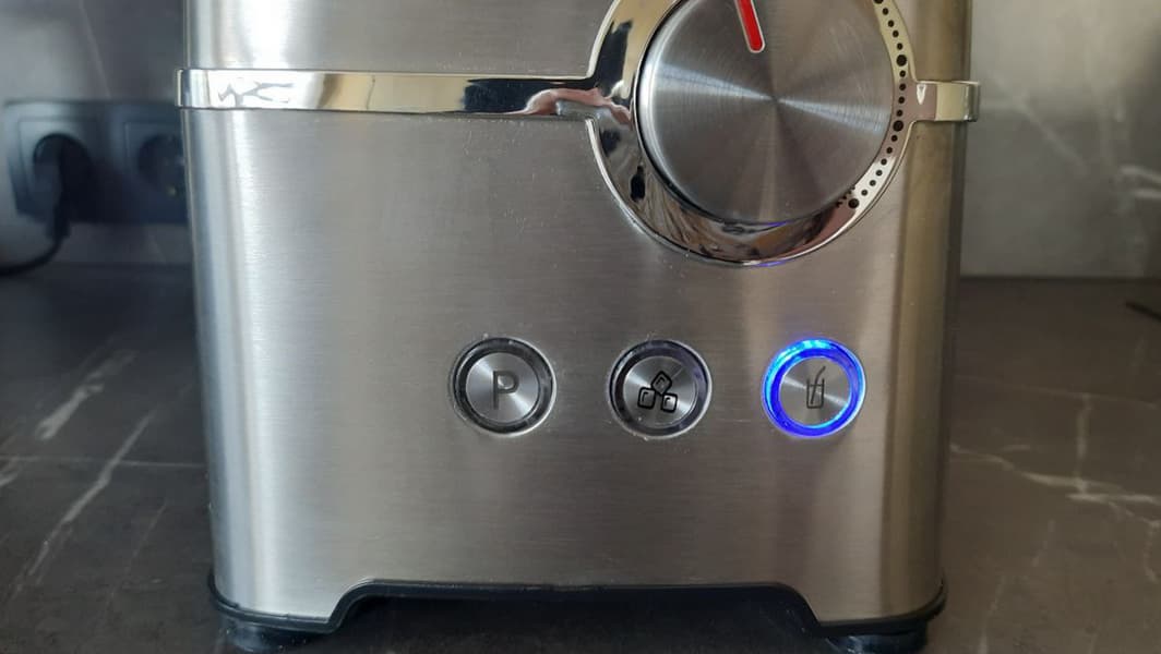 На панели управления блендером три механические кнопки с синей подсветкой и круглый поворотный регулятор.