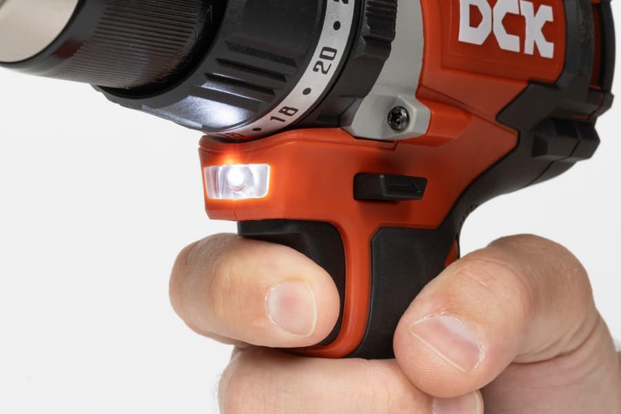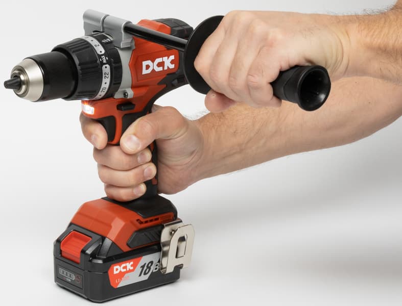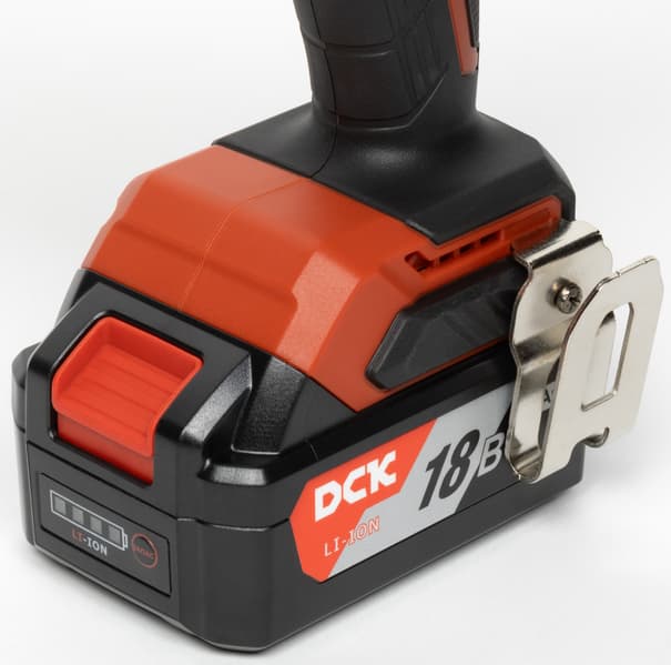 Фишка торговой марки DCK — крепежная скоба. Она имеется даже у компактных шуруповертов этого бренда. Скоба-крюк, которую можно перевесить на любую сторону корпуса, освобождает руки при проведении работ. Подвесил шуруповерт на ремень, и перемещайся по стремянке, используя обе руки. Очень удобно.
