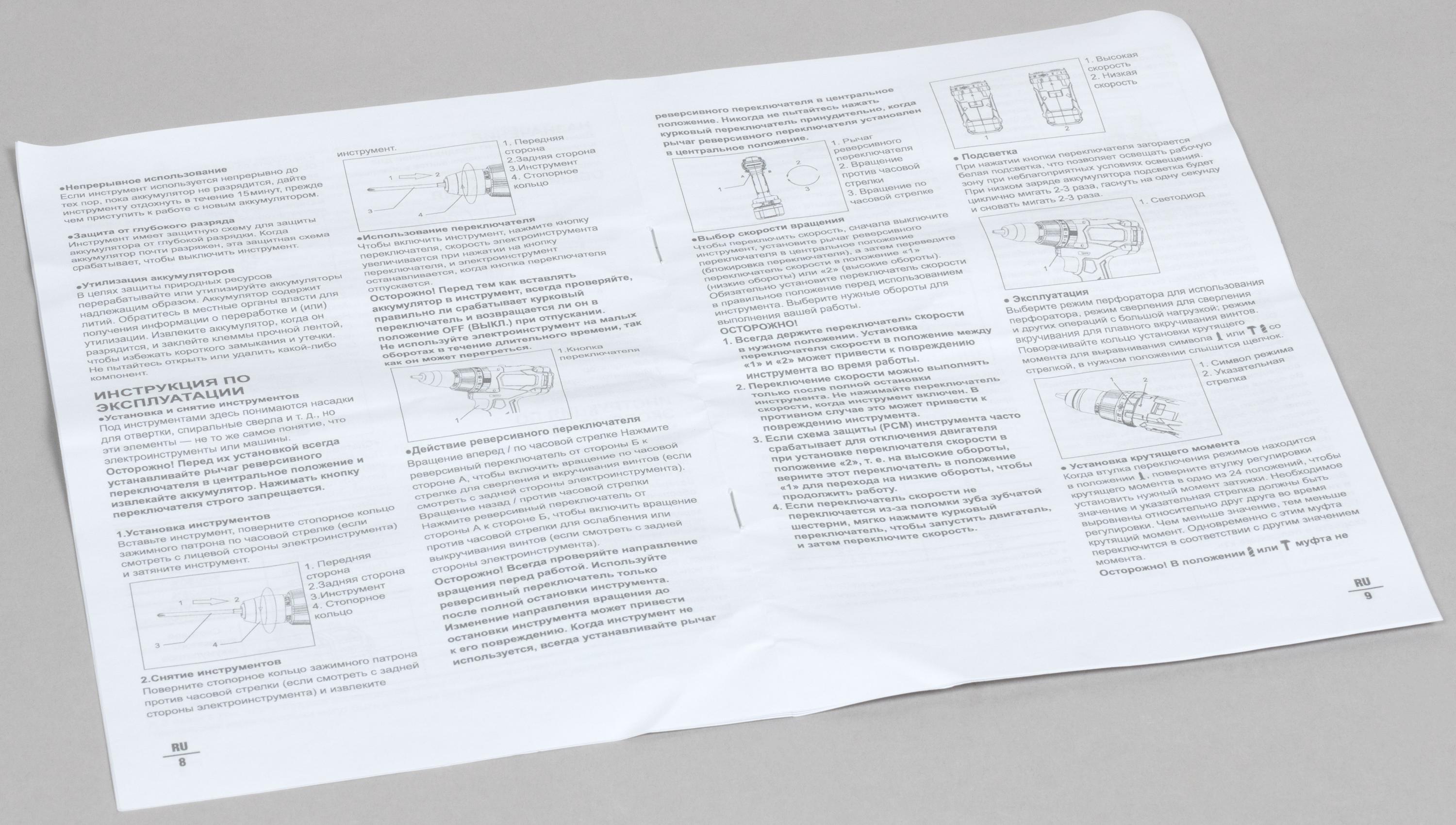 Прилагаемые к зарядному устройству и гайковерту инструкции доходчиво разъясняют не только меры безопасности, но и устройство инструмента, а также приемы работы. Единственный недостаток — иллюстрации мелковаты.