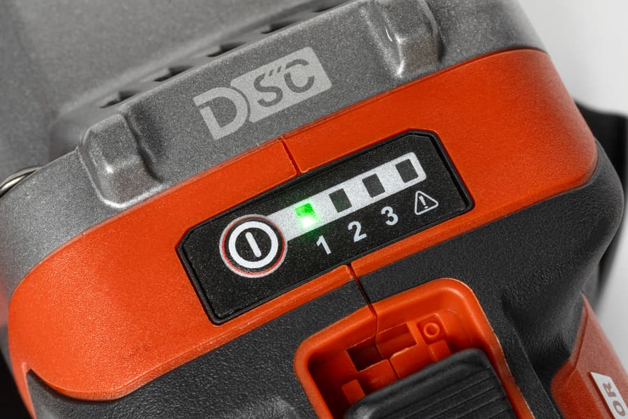 Наш инструмент снабжается двумя 18-вольтовыми аккумуляторами емкостью 5 А·ч и одним зарядным устройством. Зарядка батареи длится около 90 минут.