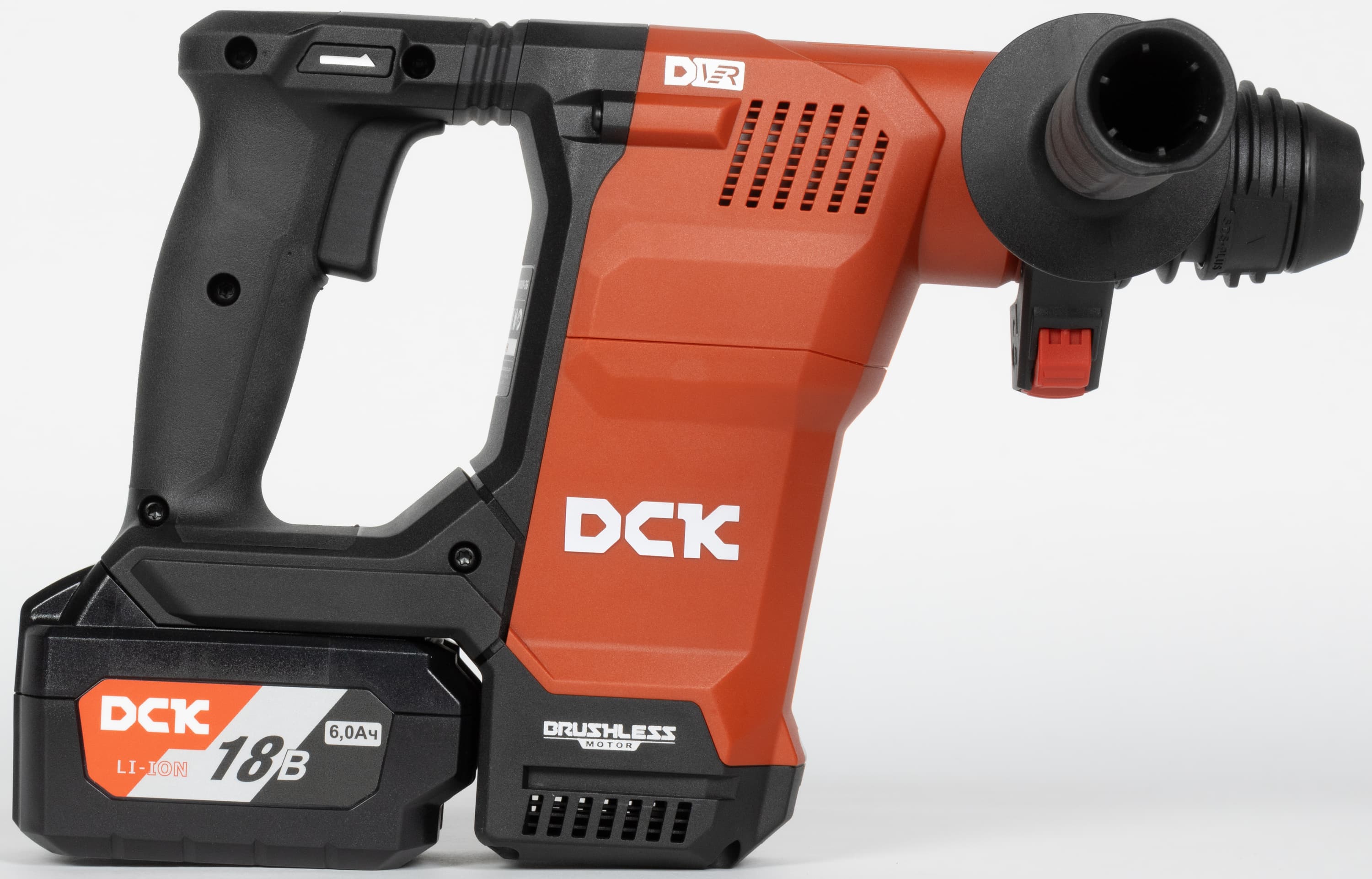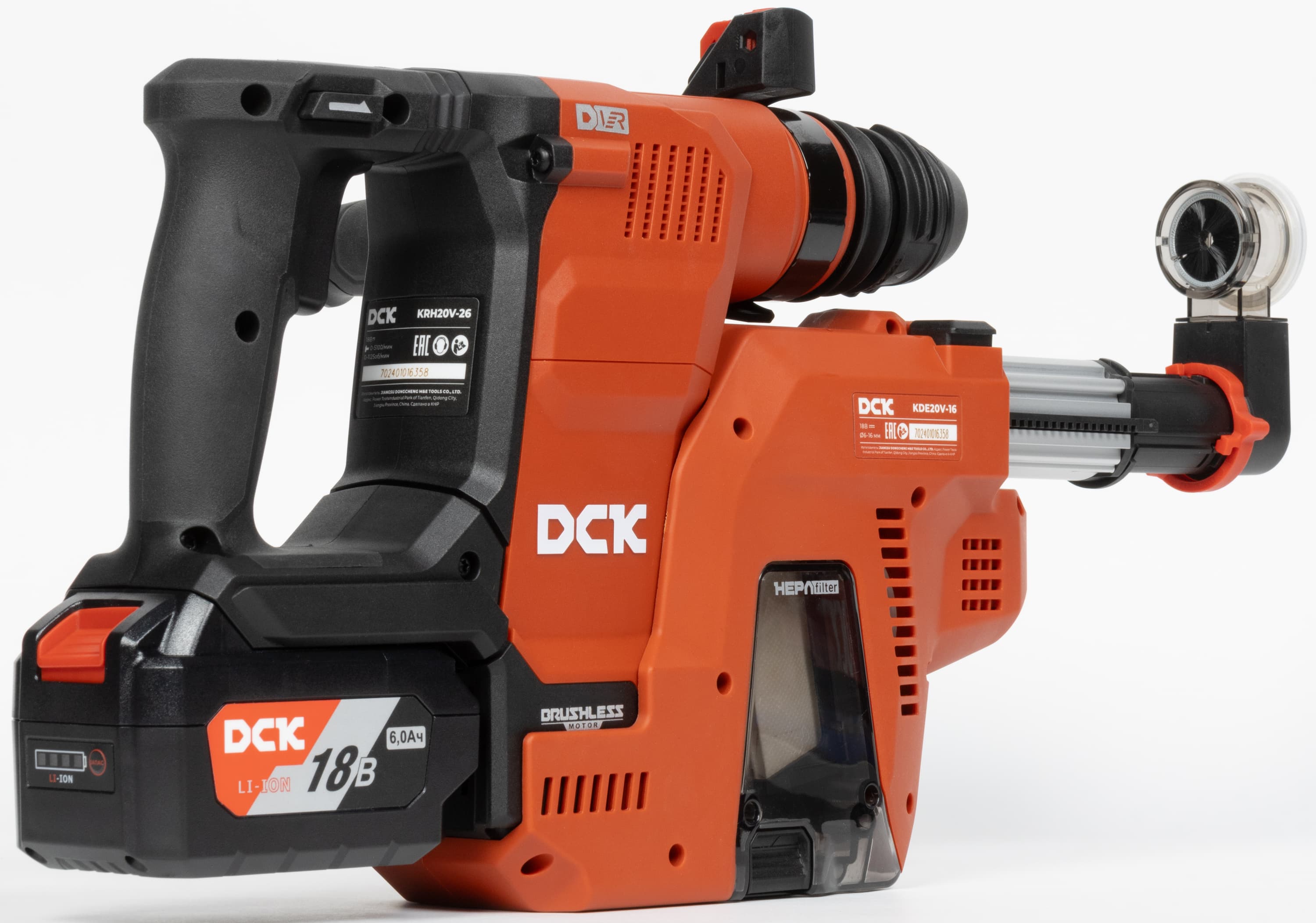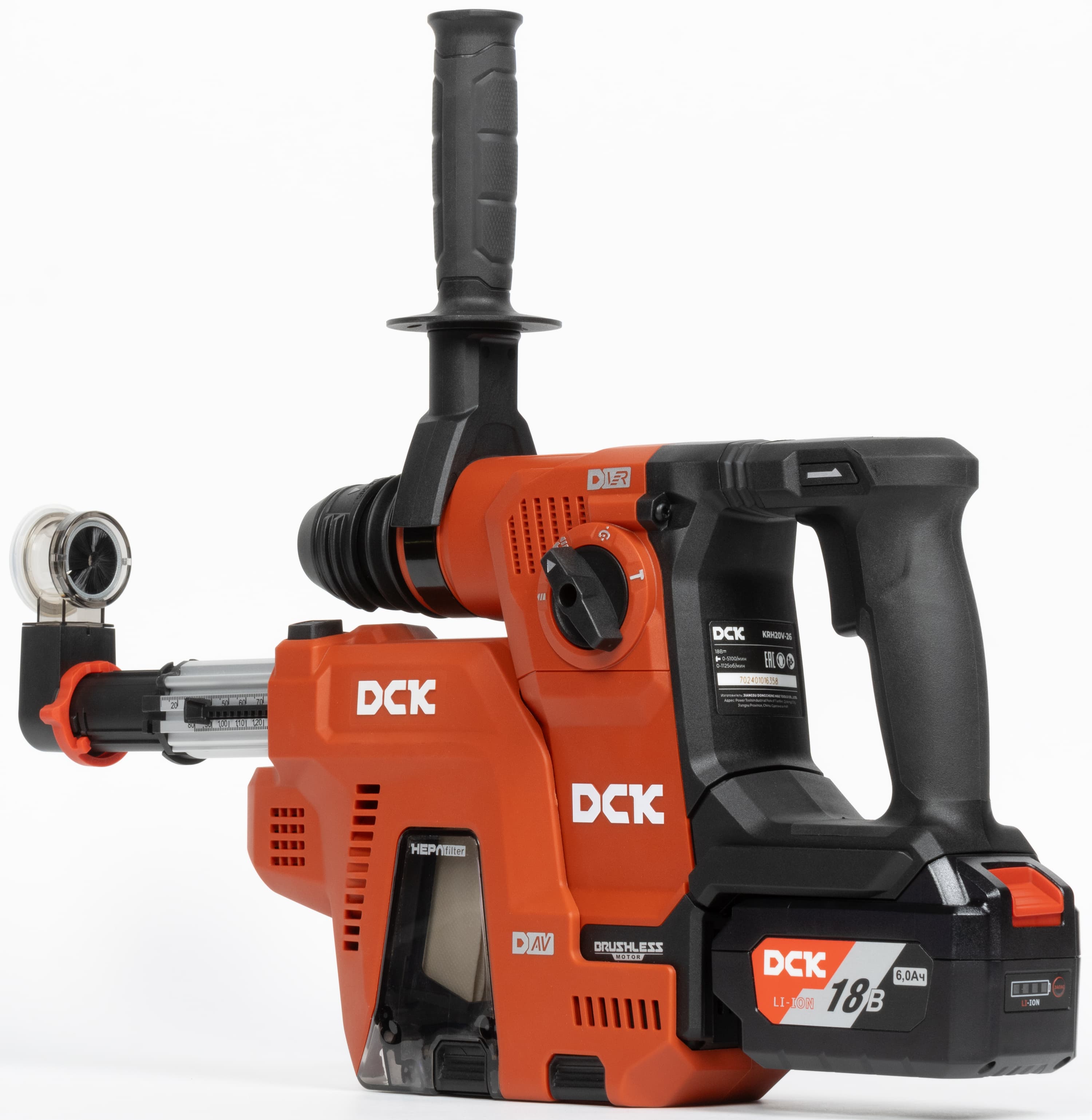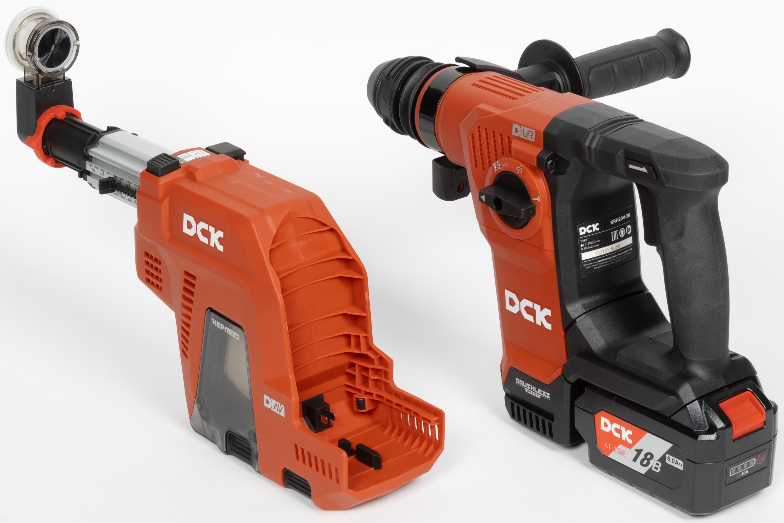 DCK KRH20V-26 — уникальный инструмент как по исполнению, так и качеству. Мощный бесщеточный двигатель, нижний тип подсветки, режим долбления, встроенная антивибрационная система, насадка-пылесос — эти качества позволяют отнести инструмент к профессиональному сегменту.