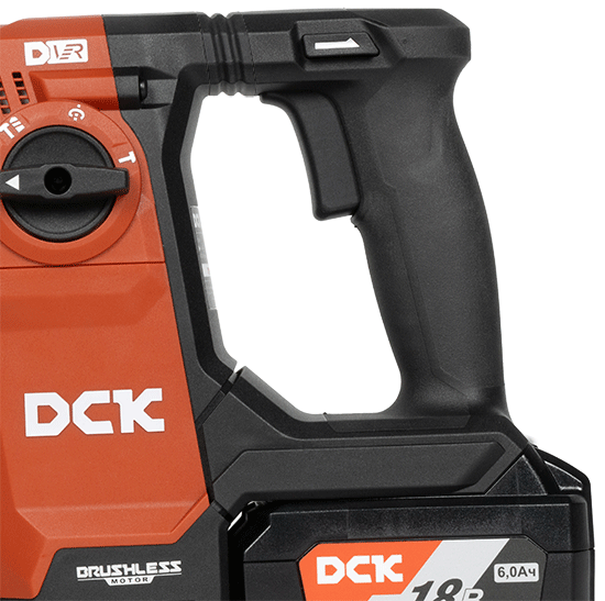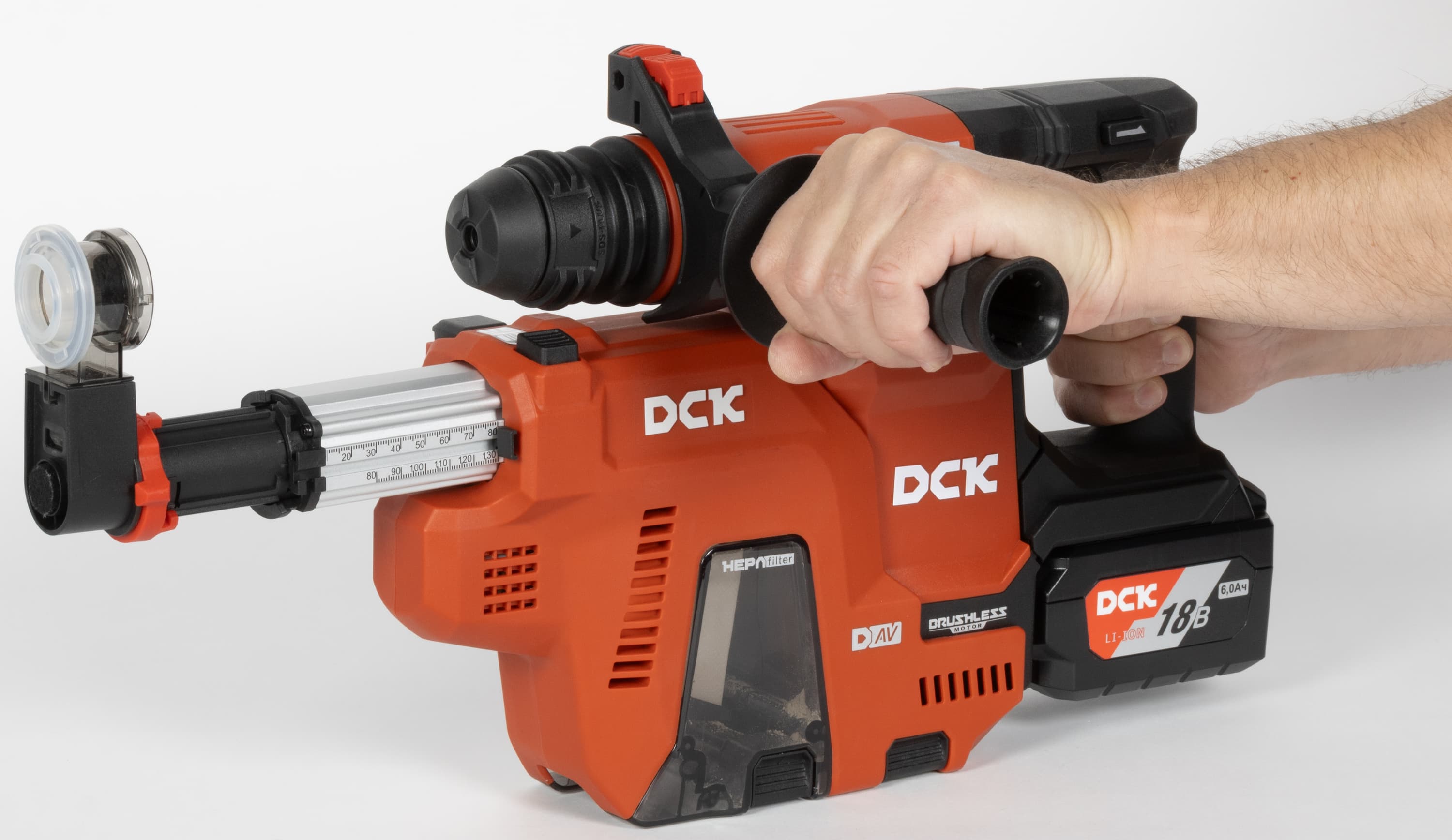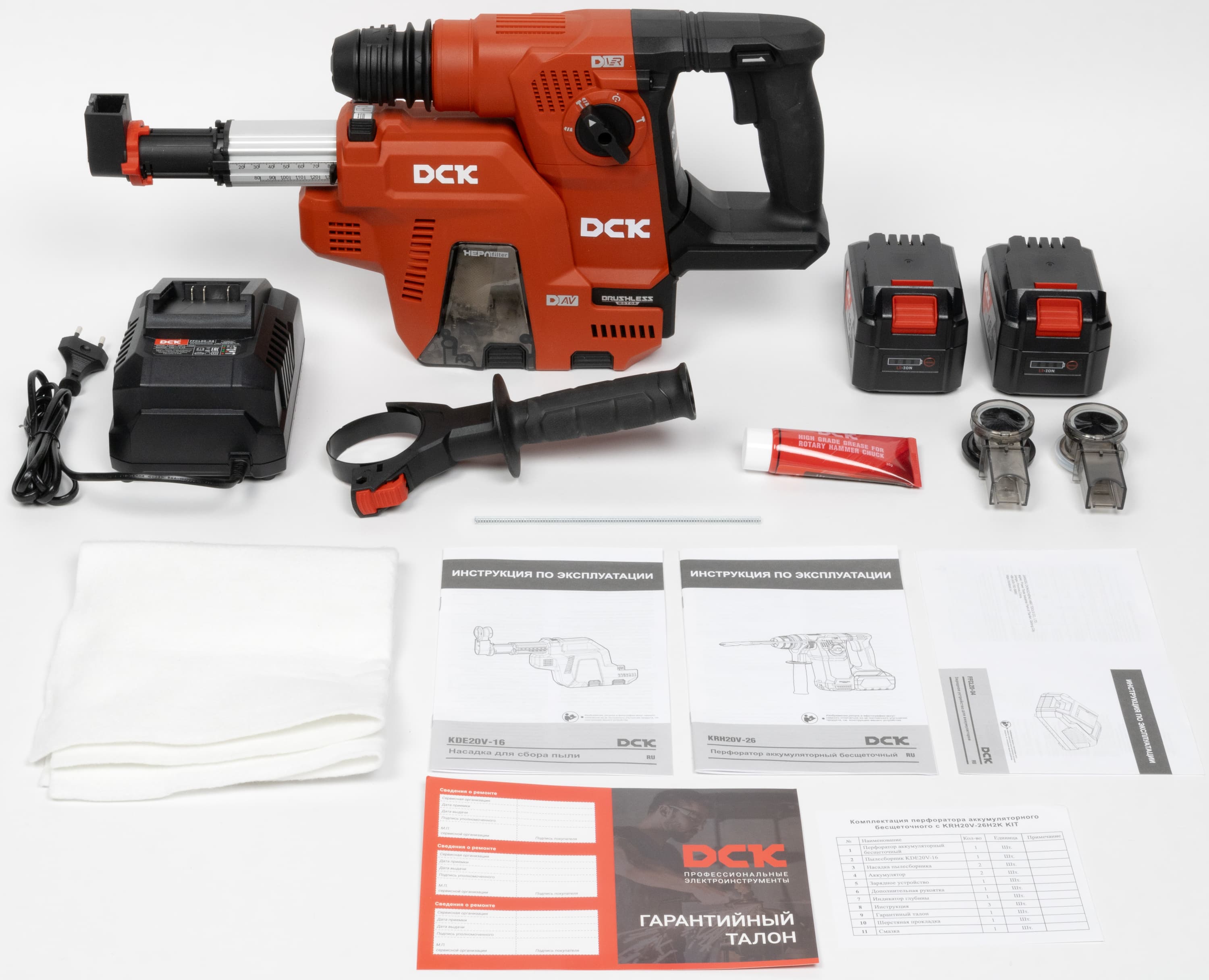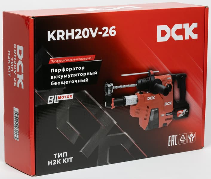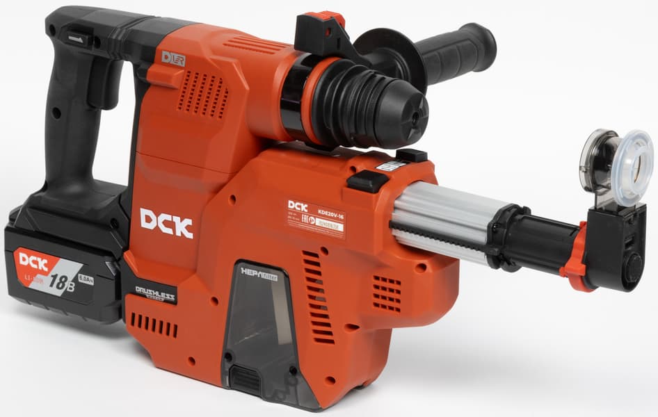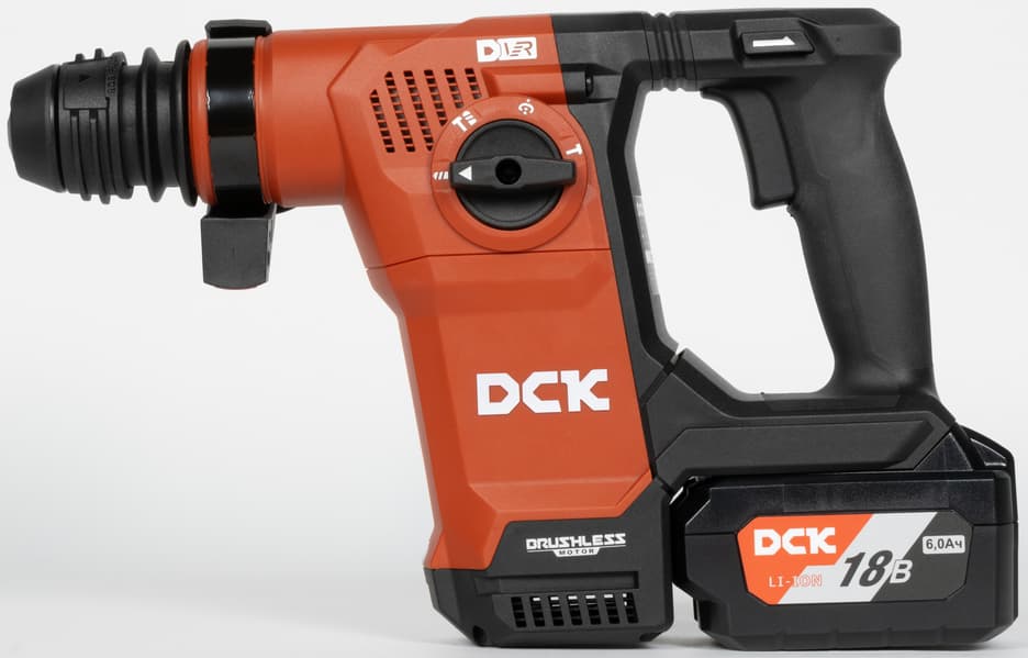 DCK KRH20V-26 — уникальный инструмент как по исполнению, так и качеству. Мощный бесщеточный двигатель, нижний тип подсветки, режим долбления, встроенная антивибрационная система, насадка-пылесос — эти качества позволяют отнести инструмент к профессиональному сегменту.
