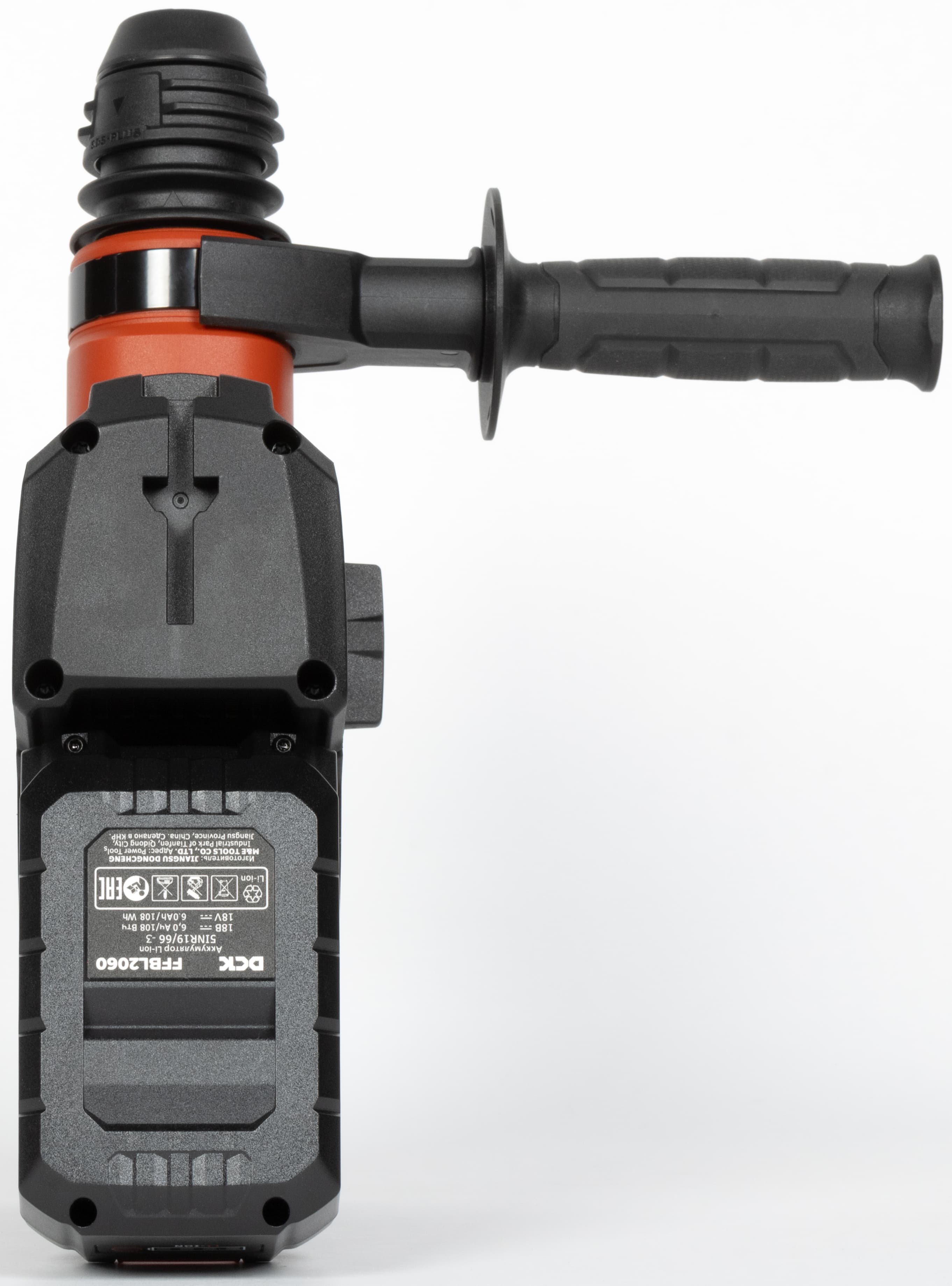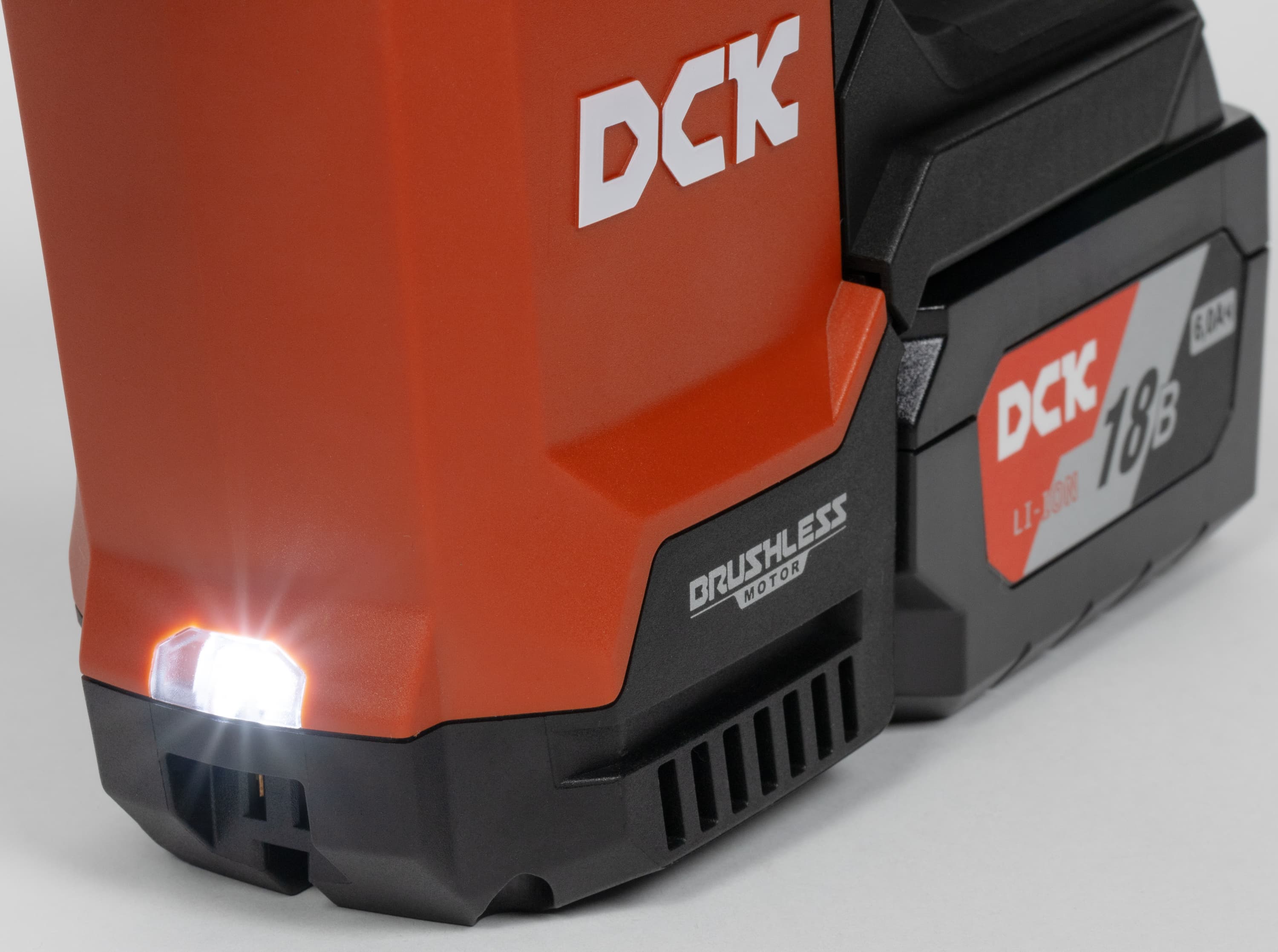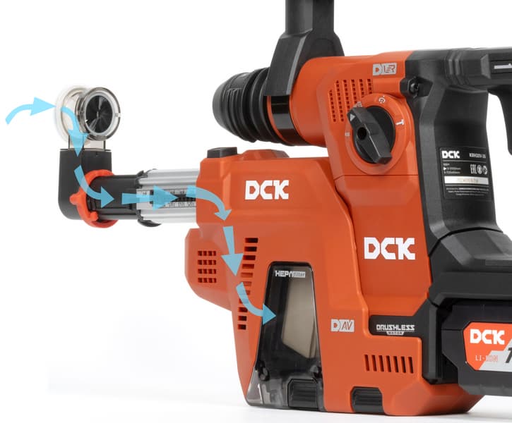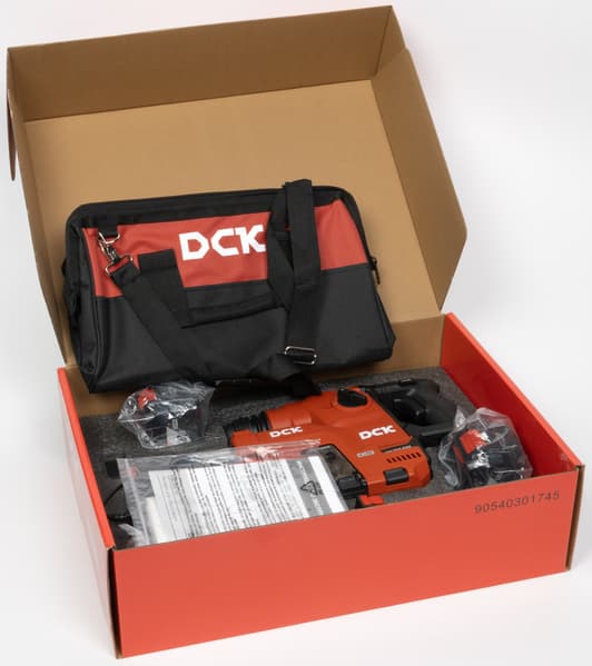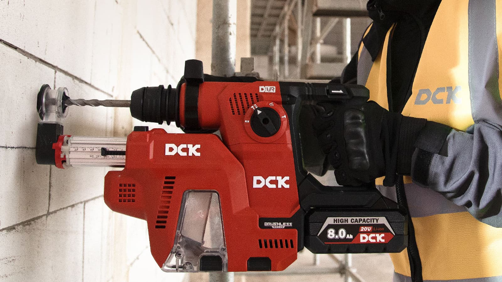 DCK KRH20V-26 — уникальный инструмент как по исполнению, так и качеству. Мощный бесщеточный двигатель, нижний тип подсветки, режим долбления, встроенная антивибрационная система, насадка-пылесос — эти качества позволяют отнести инструмент к профессиональному сегменту.
