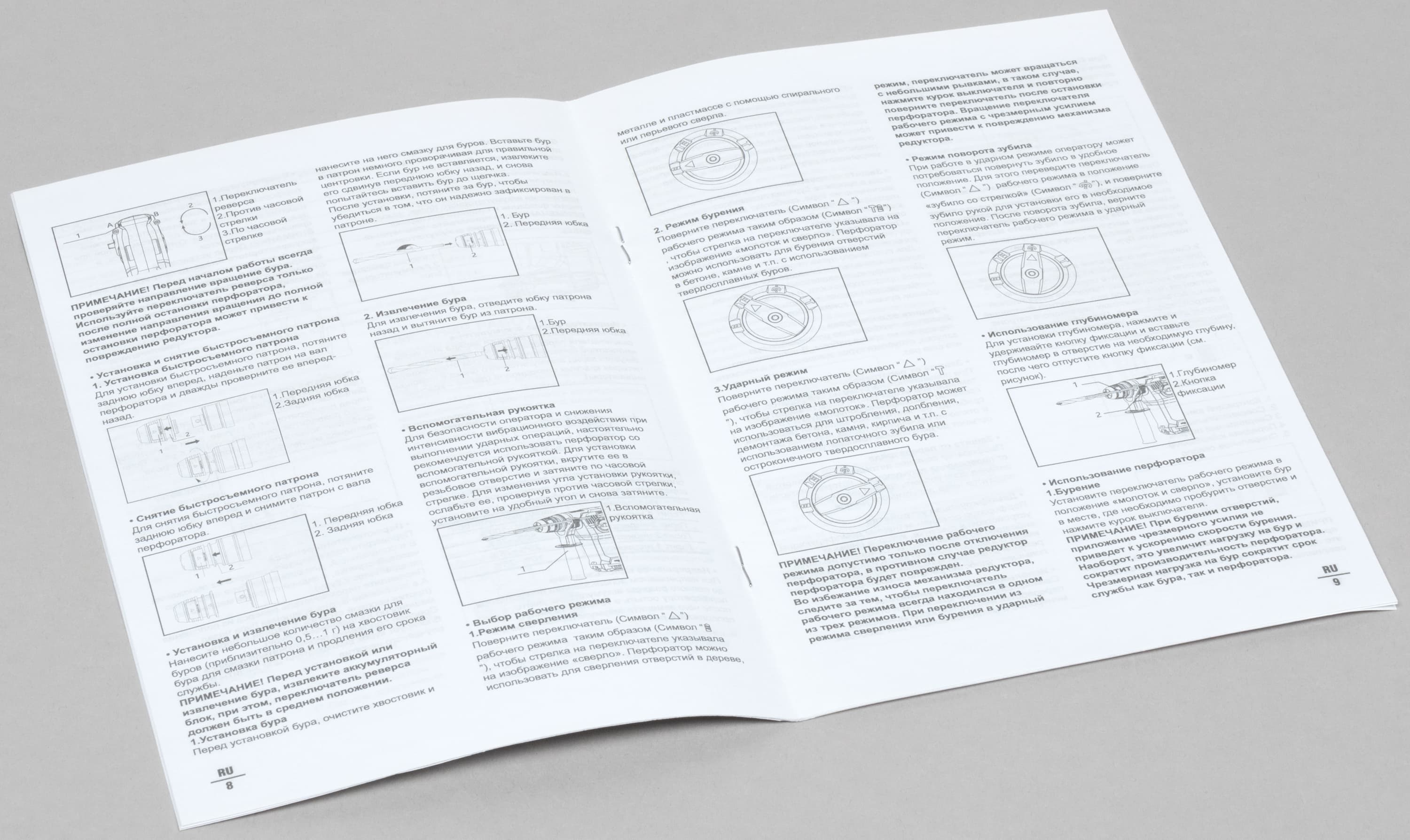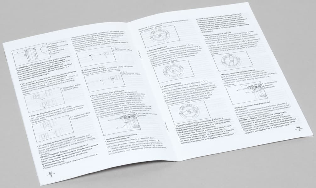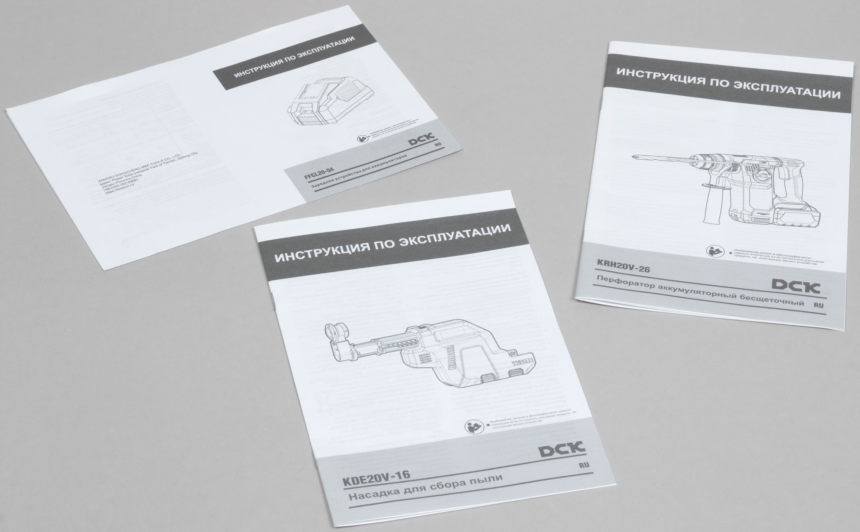 К перфоратору прилагаются три инструкции: собственно для перфоратора, для пылеуловителя и для зарядного устройства. Документы составлены толково и содержат немало полезной информации, включая рекомендуемые приемы работы. Не обошлось и без техники безопасности, конечно же.