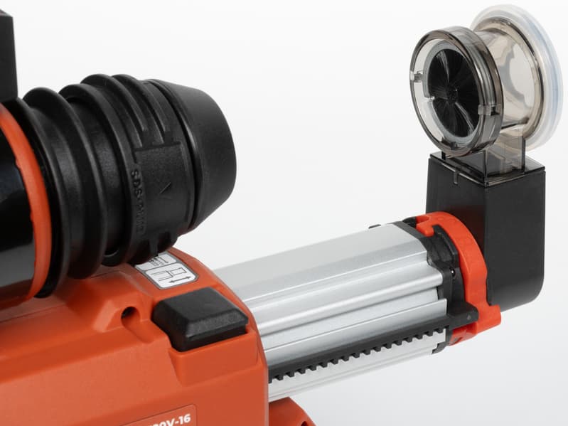 Блок пылеуловителя — это, по сути, пылесос, только не самостоятельный, а зависящий от активности инструмента, к которому он подсоединен. Внутри блока имеется двигатель, работающий от той же батареи, что и перфоратор: на фото можно видеть две клеммы, через которые двигатель пылесоса получает питание. Есть тут и полноценный пылесборник с бумажным фильтром.