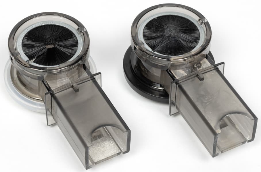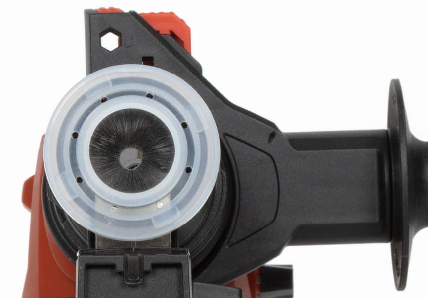 С обратной стороны, направленной на оператора, насадка закрывается щеткой, концы которой направлены внутрь, так, что охватывают сверло, бур и другую оснастку, не давая пыли проникнуть наружу.