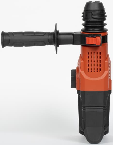 Имея похожие с перфоратором габариты, она легко к нему пристегивается, в итоге получается прочная цельная конструкция. Очевидно, что при этом дополнительная рукоять может быть повернута только вбок или вверх, но не вниз.