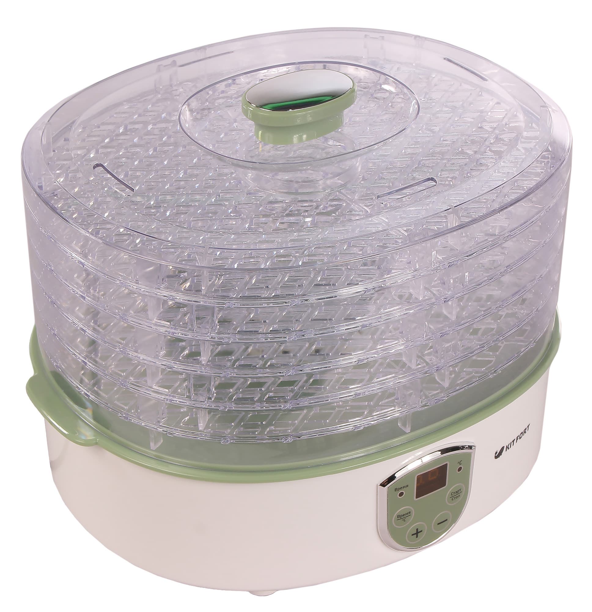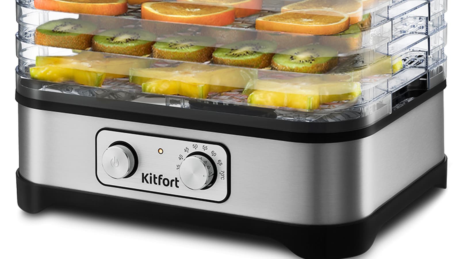 Kitfort KT-1912 — недорогая, компактная и не слишком мощная сушилка для дома. Вместимость прибора составляет около 2 кг сырья, так что для переработки осеннего урожая такая сушилка вряд ли подойдет. А вот с несложными повседневными задачами она вполне способна справиться.