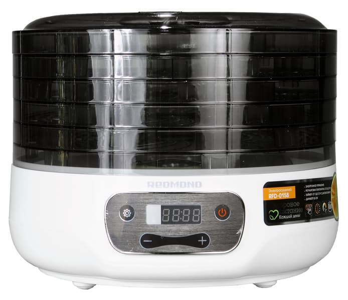 | Redmond RFD-0158 | 250 Вт | вертикальный | 5 | возможность изменения параметров в процессе сушки, регулируемая высота лотков, таймер, прозрачные лотки |