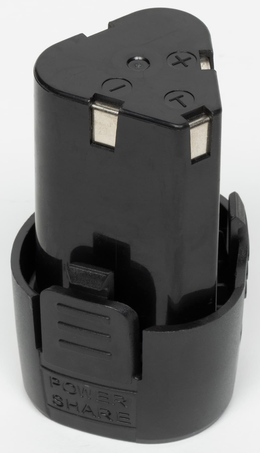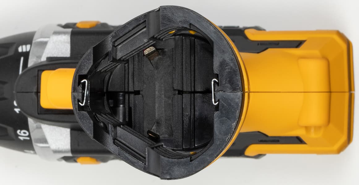Прилагаемый аккумулятор вставляется в подошву шуруповерта и плотно удерживается на месте. Отстегнуть аккумулятор с первого раза вряд ли получится, его удерживают два зацепа по бокам. Тут нужна сноровка.